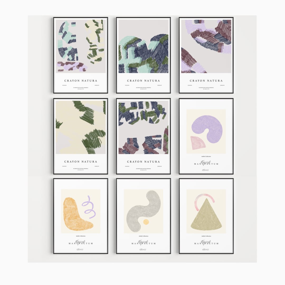 クレヨンで描かれた抽象画ポスターです。らくがきのようなラフなタッチで色が塗られています。モダンで落ち着いた色合いのデザインと、優しいパステル調のデザインのものがあります。