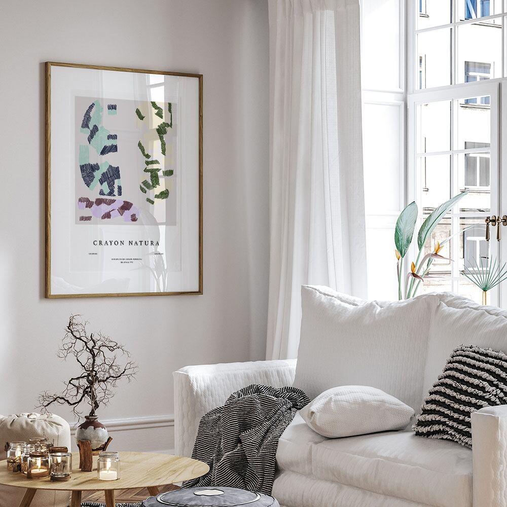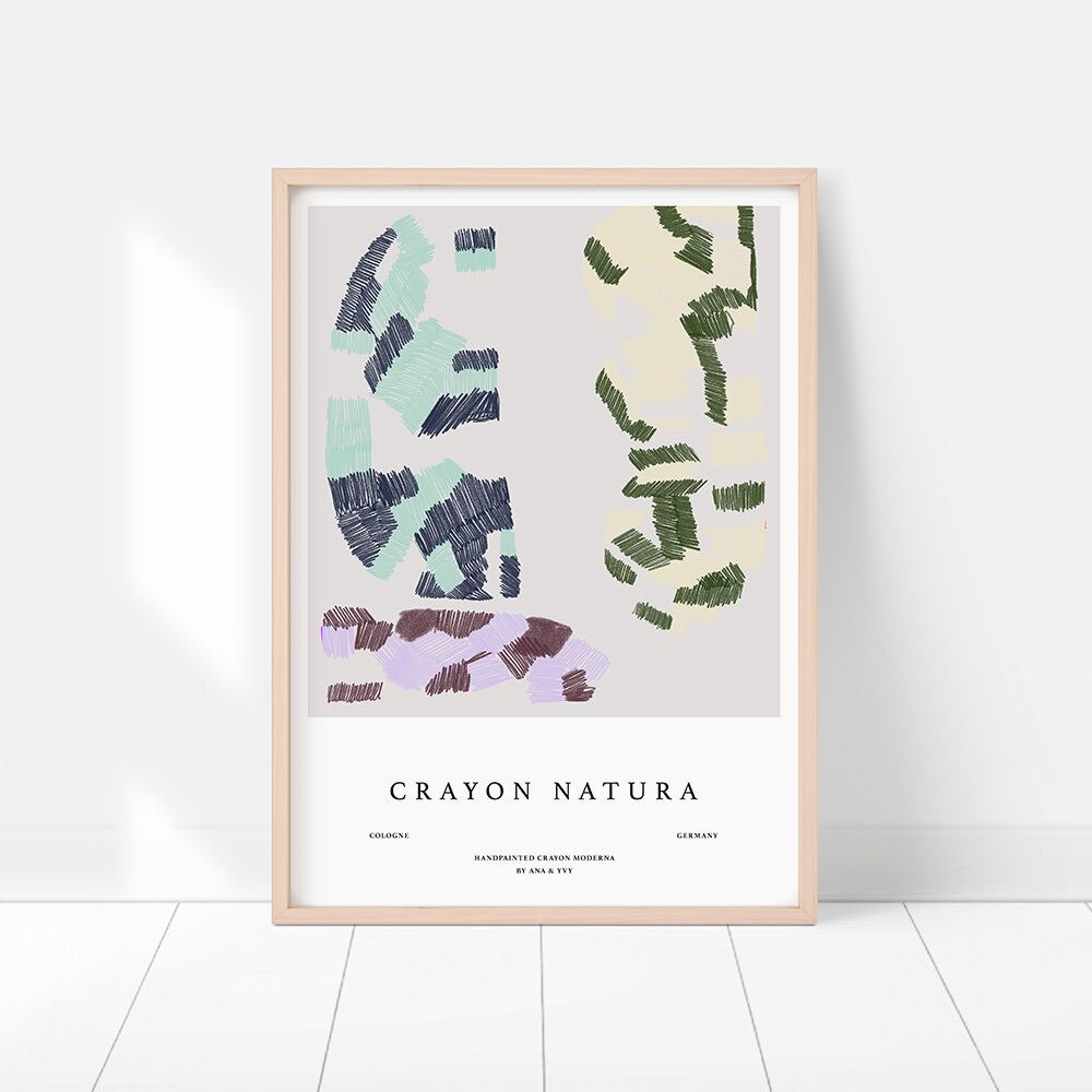 クレヨンで描かれた抽象画ポスターです。らくがきのようなラフなタッチで色が塗られています。モダンで落ち着いた色合いのデザインと、優しいパステル調のデザインのものがあります。