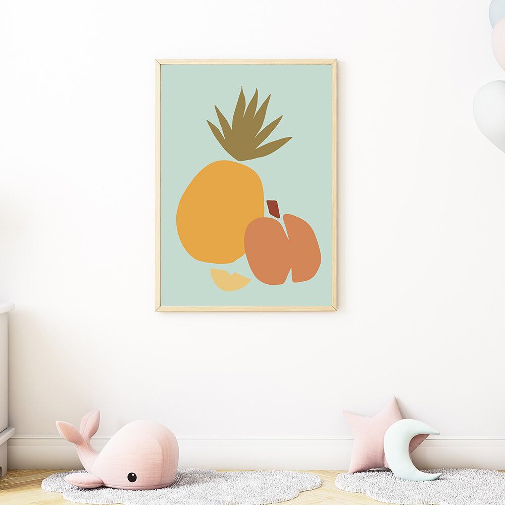 子供部屋にぴったりな、食べ物ポスターです。フルーツやドーナツ、アイスクリームといったお子様が好きな食べ物がカラフルでポップに描かれています。夏にぴったりなビタミンカラーは元気を与えてくれます。
