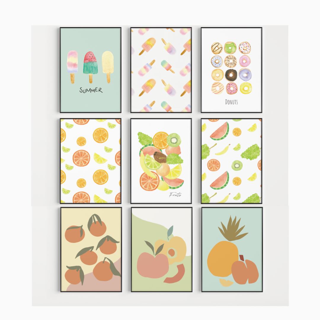 子供部屋にぴったりな、食べ物ポスターです。フルーツやドーナツ、アイスクリームといったお子様が好きな食べ物がカラフルでポップに描かれています。夏にぴったりなビタミンカラーは元気を与えてくれます。
