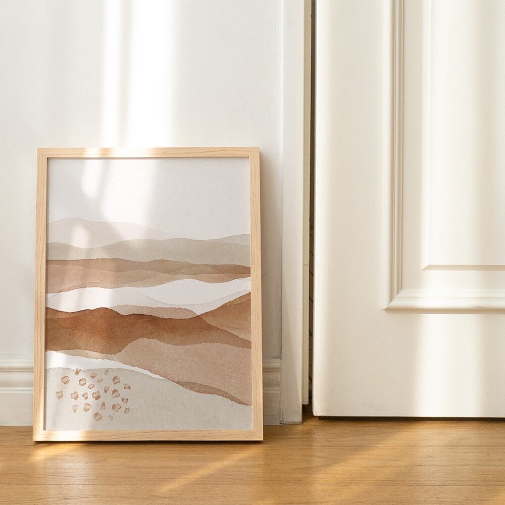 ベージュ・ブラウンを基調とした抽象風景画シリーズです。インテリアに落ち着きを与えてくれます。同じベージュ調の抽象画ポスターや、ベージュ調の英字ポスターとの相性が良いので、ぜひ合わせて飾ってみてください。