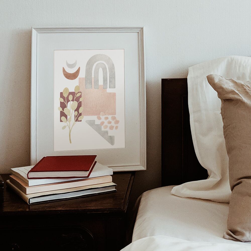同じ色調の抽象風景画ポスターや、ベージュ調の英字ポスターとの相性が良いので、ぜひ合わせて飾ってみてください。