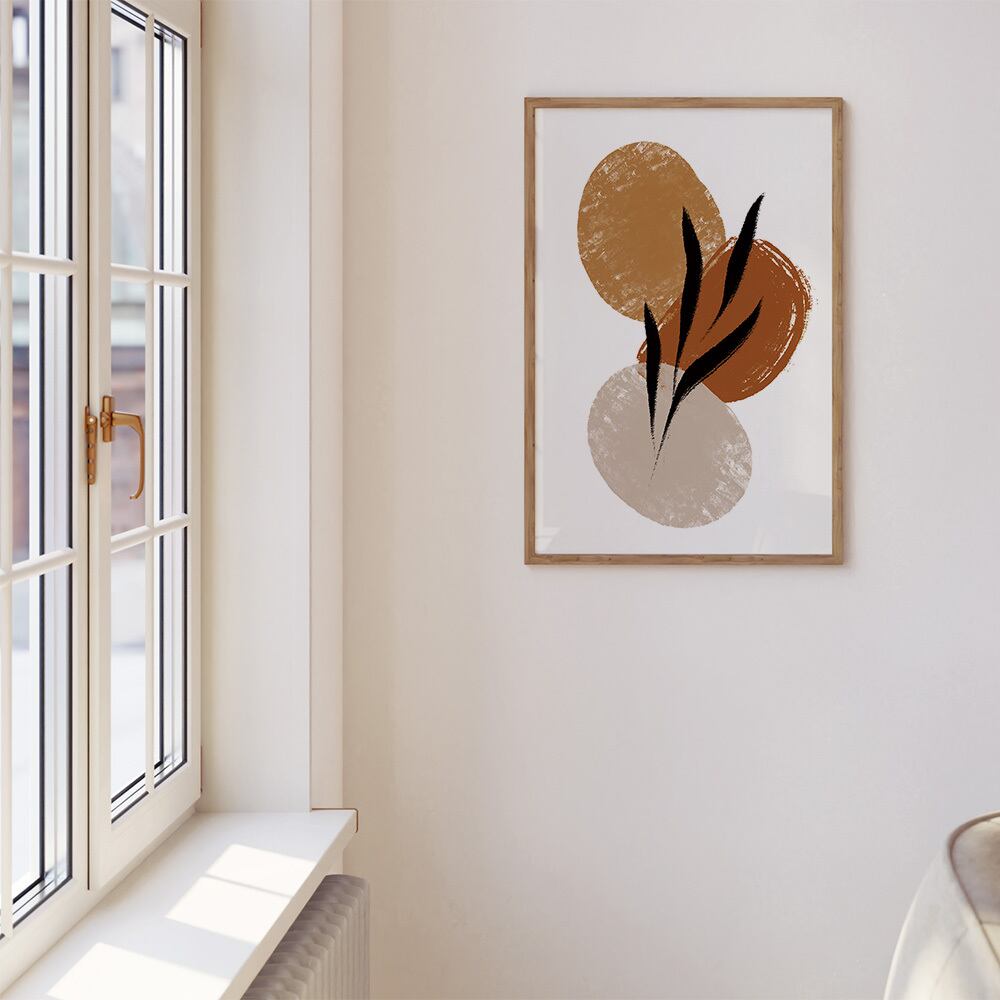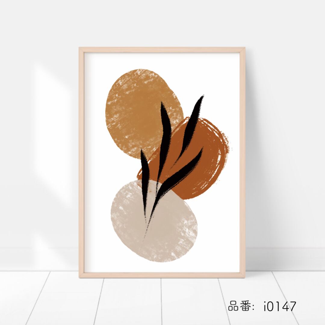 ブラウンやベージュ、黒を基調とした抽象的な形のポスターです。葉っぱや線のモチーフなども取り入れ、モダンな印象に仕上げました。かっこいいモダンなインテリアがお好きな方や、カフェにもぴったりです。