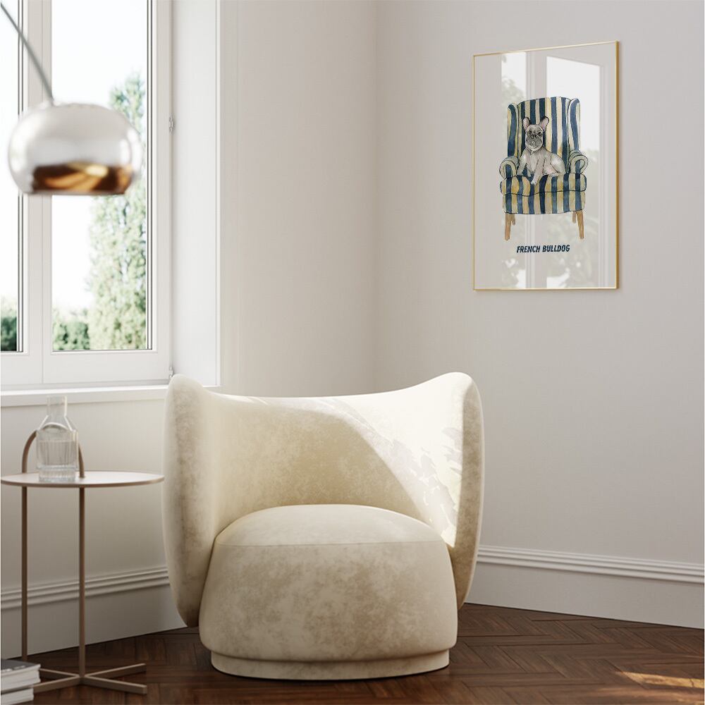 当店で常に人気のフレンチブルドッグのポスターです。風船やハート、バラのバスケットと一緒に描かれている線画タイプと、椅子やクッションに座っている水彩画タイプがあります。フレンチブルドッグならではの味のある表情が、癒しを与えてくれます。