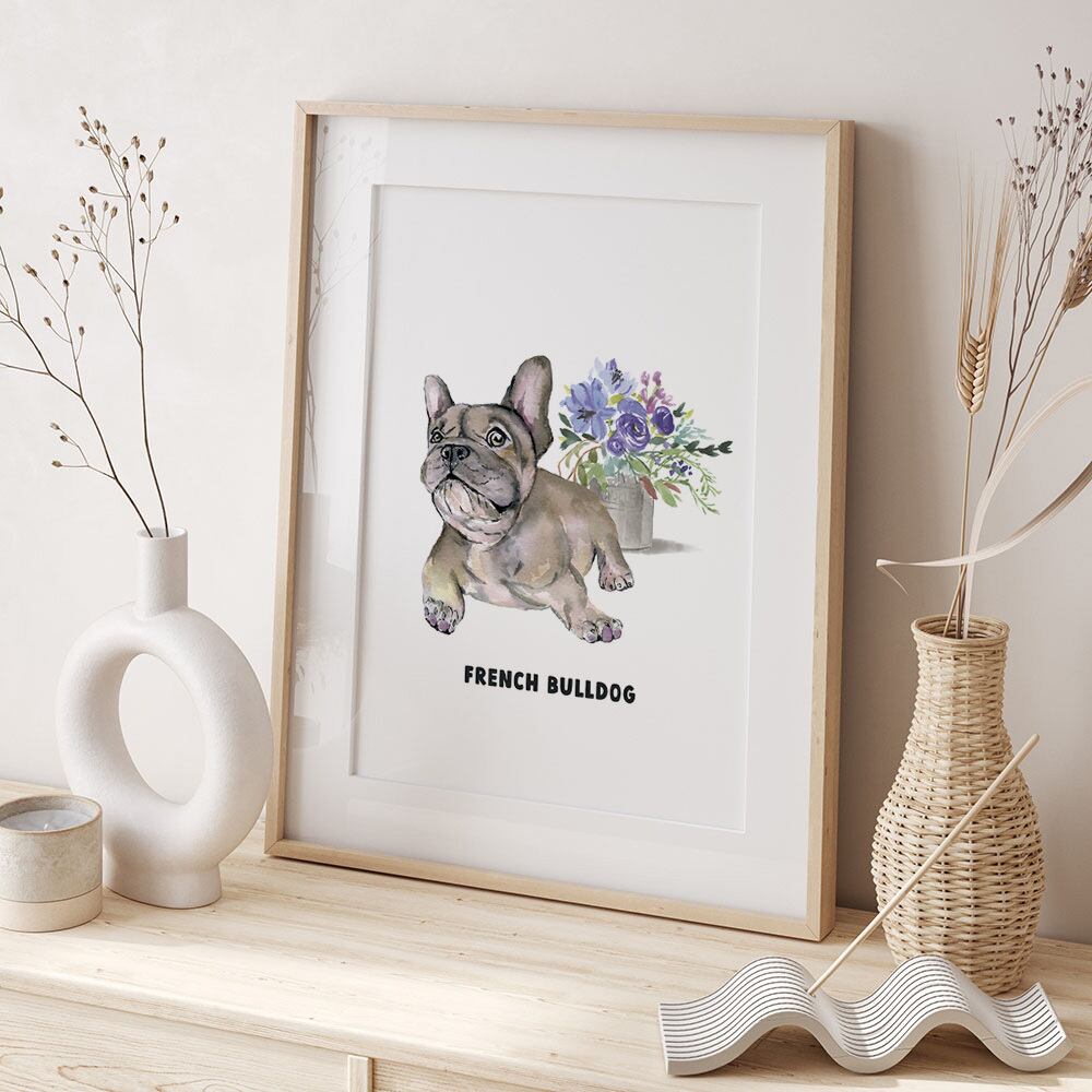 当店で常に人気のフレンチブルドッグのポスターです。風船やハート、バラのバスケットと一緒に描かれている線画タイプと、椅子やクッションに座っている水彩画タイプがあります。フレンチブルドッグならではの味のある表情が、癒しを与えてくれます。