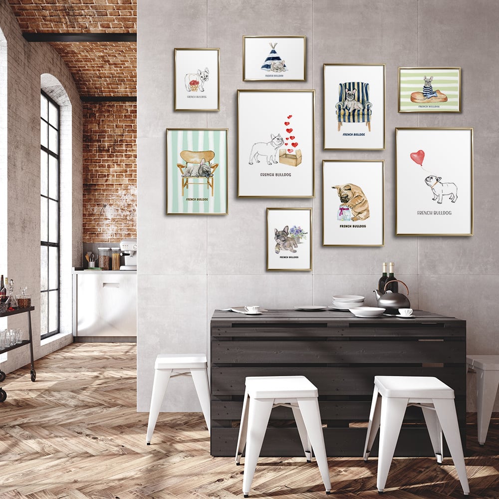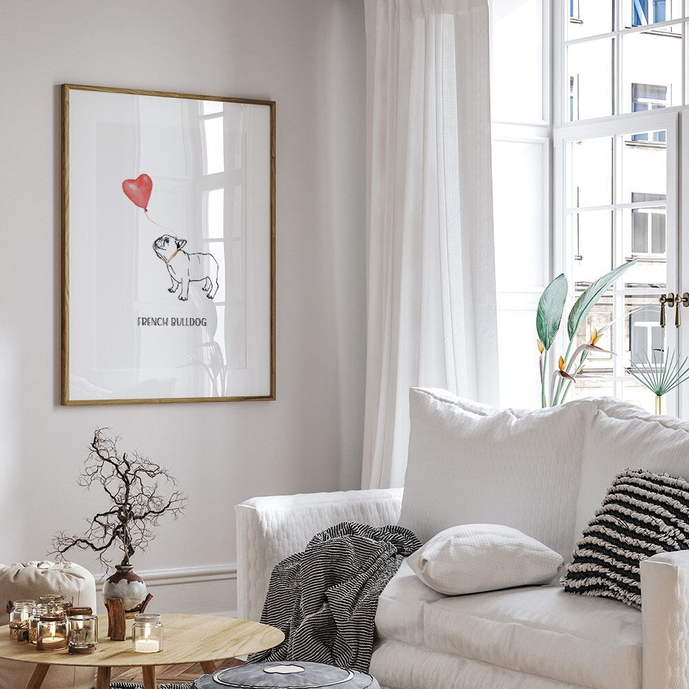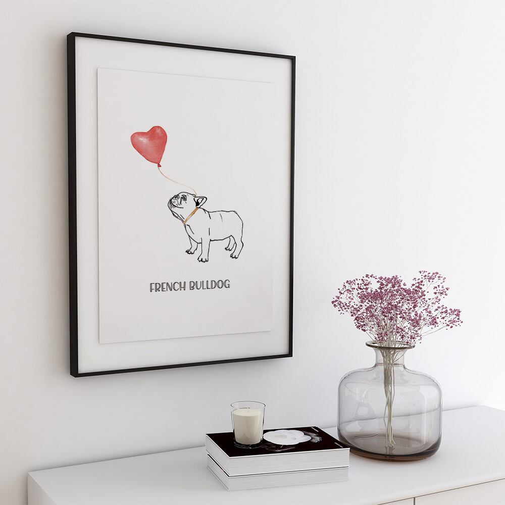 当店で常に人気のフレンチブルドッグのポスターです。風船やハート、バラのバスケットと一緒に描かれている線画タイプと、椅子やクッションに座っている水彩画タイプがあります。フレンチブルドッグならではの味のある表情が、癒しを与えてくれます。