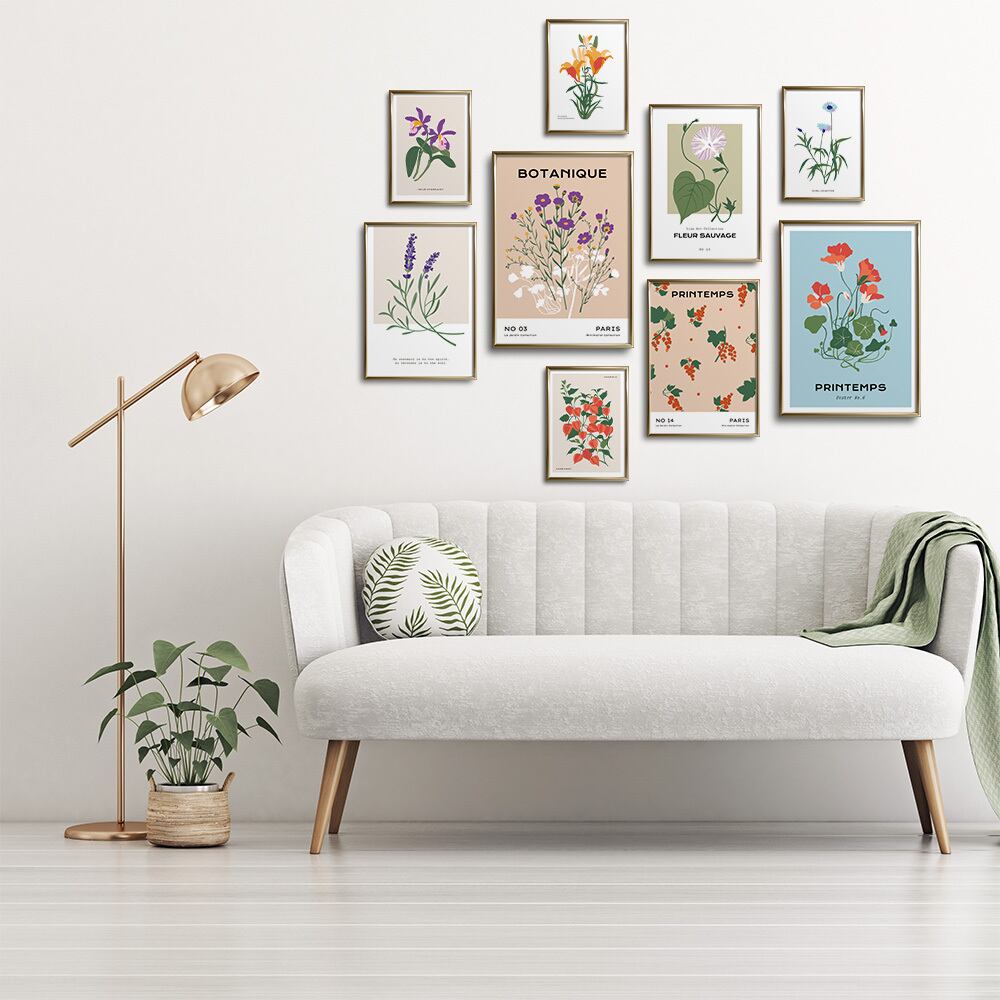 アサガオ、キイチゴ、ナスタチウム、ホオズキ、矢車草、ユリ、ラベンダー、ランなど、春から夏の草花のポスターです。カラフルで元気が出る色合いで、モダンな雰囲気に仕上げてあります。