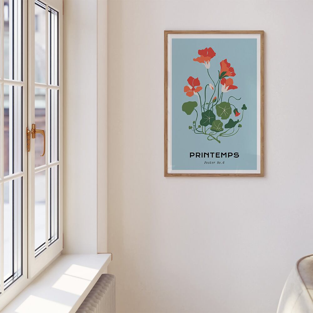 アサガオ、キイチゴ、ナスタチウム、ホオズキ、矢車草、ユリ、ラベンダー、ランなど、春から夏の草花のポスターです。カラフルで元気が出る色合いで、モダンな雰囲気に仕上げてあります。