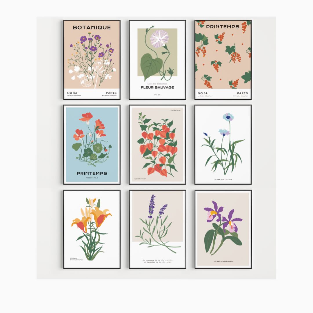 アサガオ、キイチゴ、ナスタチウム、ホオズキ、矢車草、ユリ、ラベンダー、ランなど、春から夏の草花のポスターです。カラフルで元気が出る色合いで、モダンな雰囲気に仕上げてあります。