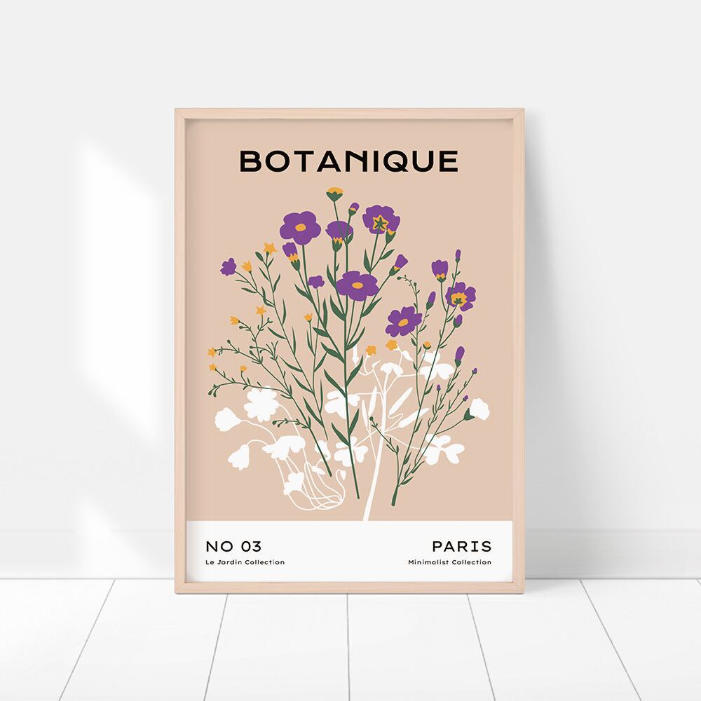 アサガオ、キイチゴ、ナスタチウム、ホオズキ、矢車草、ユリ、ラベンダー、ランなど、春から夏の草花のポスターです。カラフルで元気が出る色合いで、モダンな雰囲気に仕上げてあります。