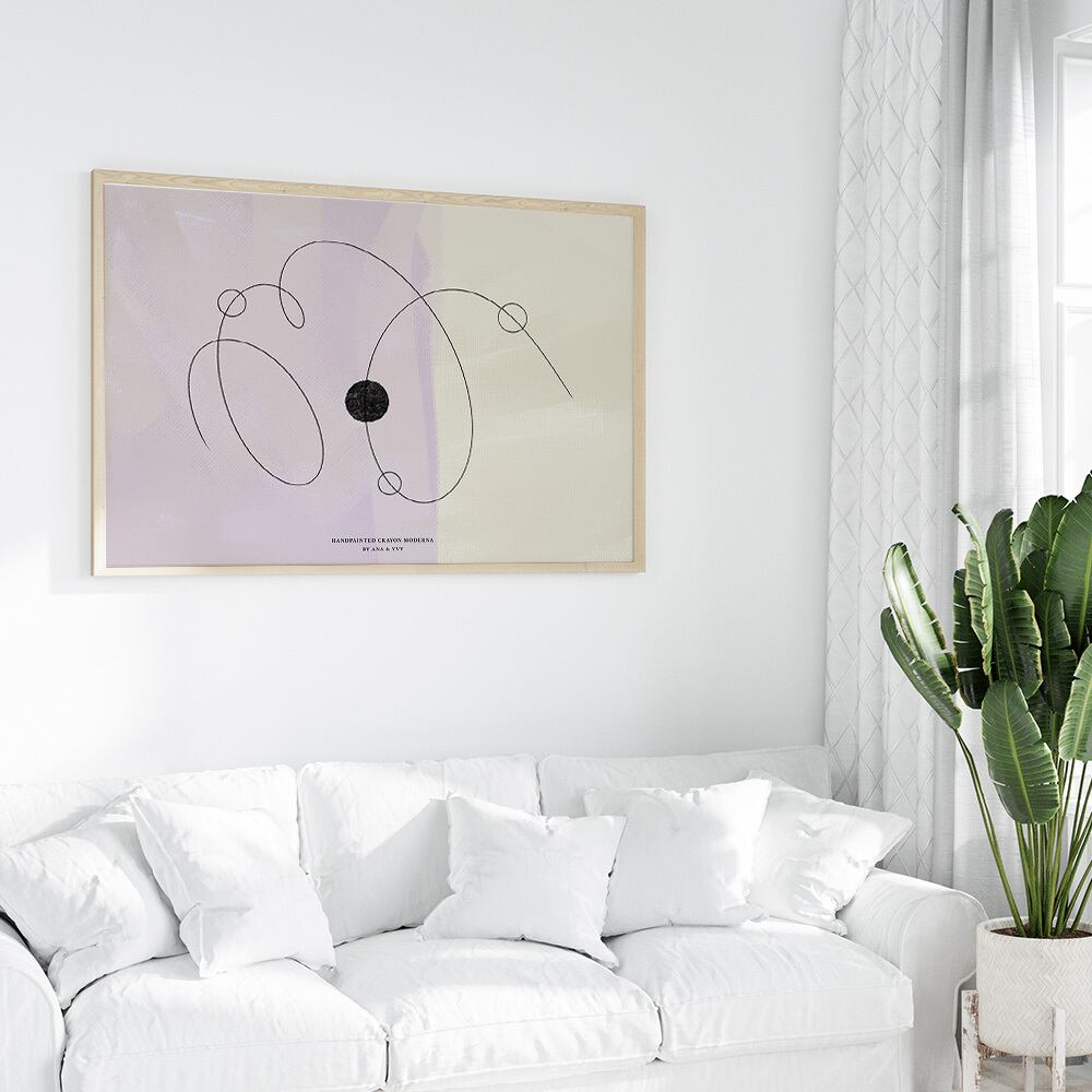 モダンな抽象画ポスター、横長バージョンです。淡いオレンジ、パープルに幾何学的な線が描かれたタイプと、線の幾何学的な形、黒い四角をモチーフとしたもの、夏らしいカラフルな形をモチーフにしたものがあります。