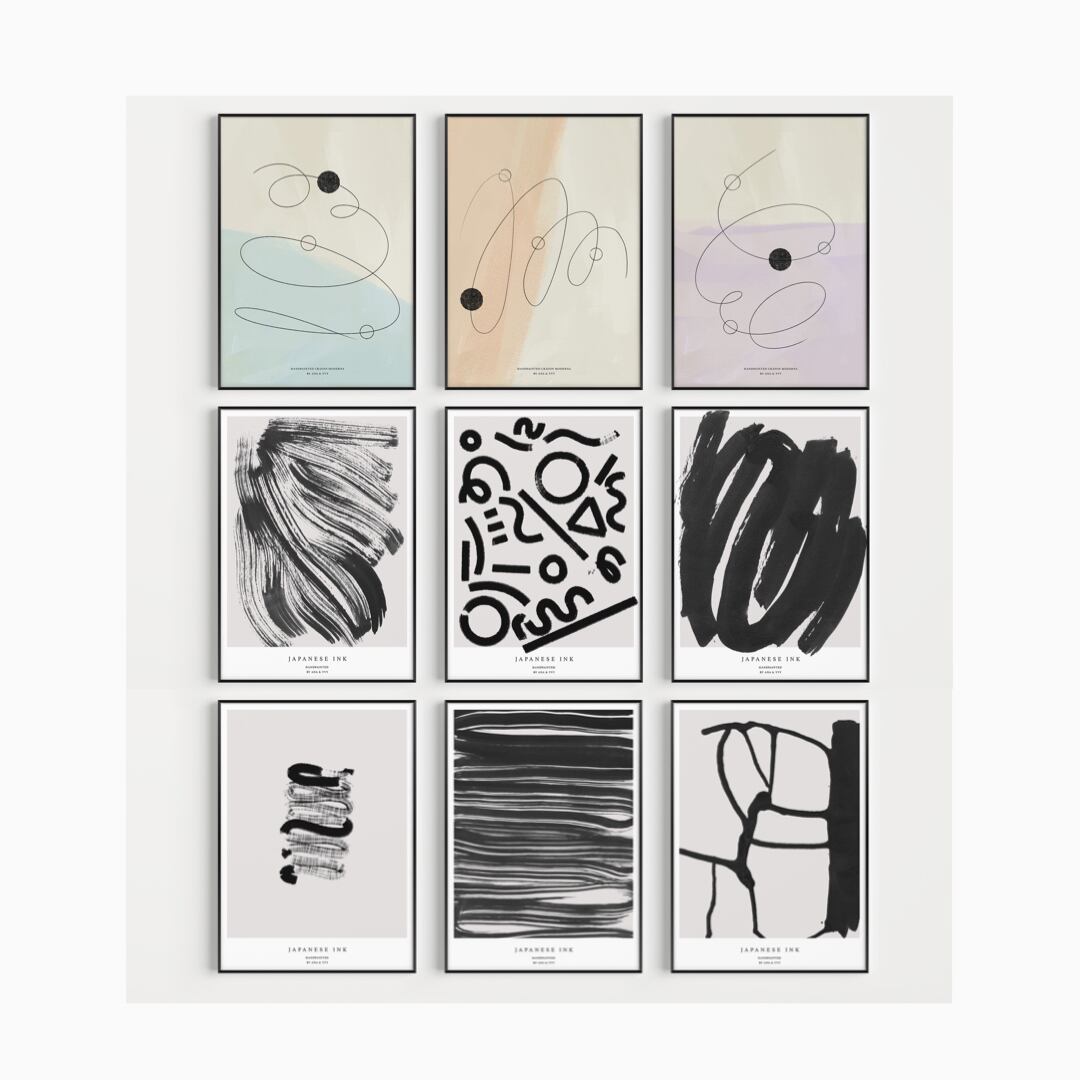 モダンな抽象画ポスターです。淡いブルー、オレンジ、パープルに幾何学的な線が描かれたタイプと、黒の線で落書きのように描かれたタイプのものがあります。