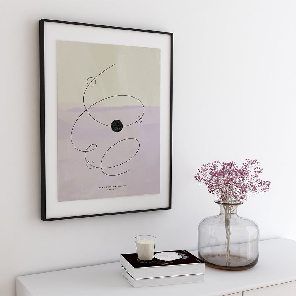 モダンな抽象画ポスターです。淡いブルー、オレンジ、パープルに幾何学的な線が描かれたタイプと、黒の線で落書きのように描かれたタイプのものがあります。