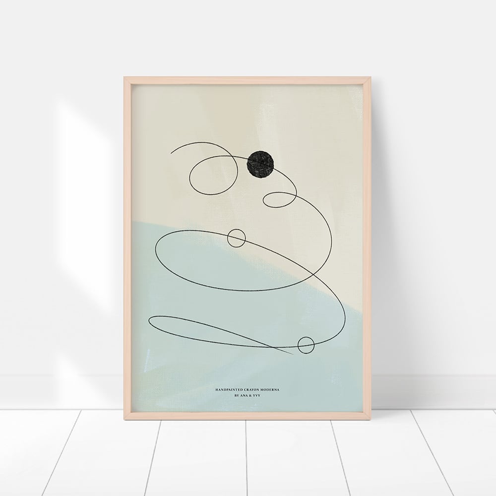 モダンな抽象画ポスターです。淡いブルー、オレンジ、パープルに幾何学的な線が描かれたタイプと、黒の線で落書きのように描かれたタイプのものがあります。