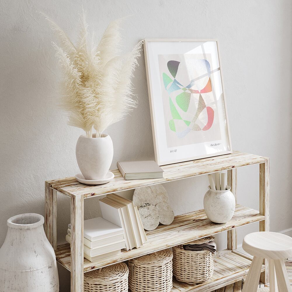 モダンな抽象画ポスターです。ベージュ調に幾何学的な線が描かれているシンプルなものと、カラフルな幾何学模様のものがあります。