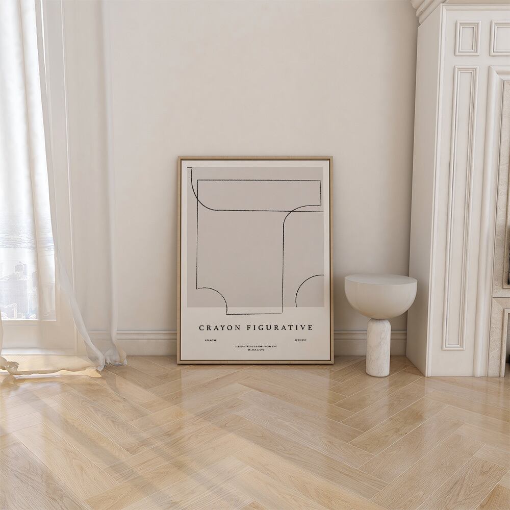 モダンな抽象画ポスターです。ベージュ調に幾何学的な線が描かれているシンプルなものと、カラフルな幾何学模様のものがあります。