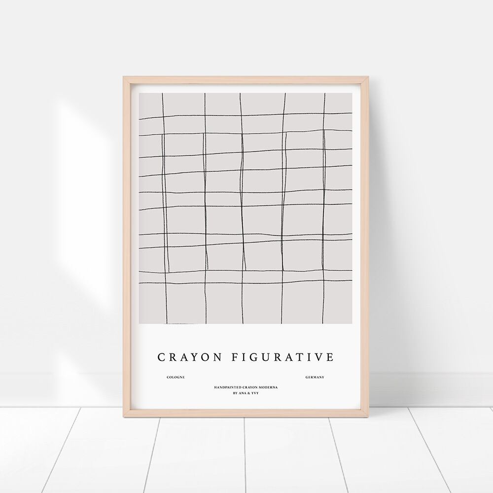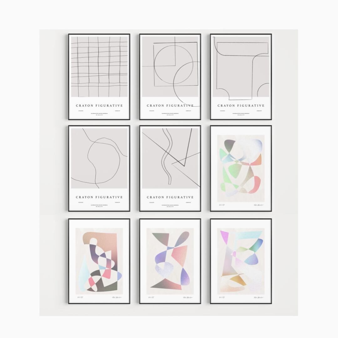 モダンな抽象画ポスターです。ベージュ調に幾何学的な線が描かれているシンプルなものと、カラフルな幾何学模様のものがあります。