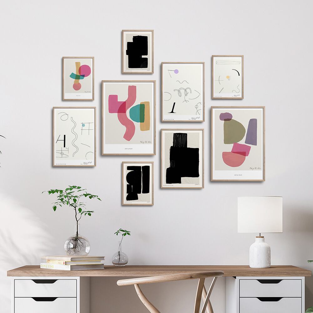 モダンな抽象画ポスターです。幾何学的な形のモチーフのもの、黒い四角をモチーフとしたもの、夏らしいカラフルな形をモチーフにしたものがあります。