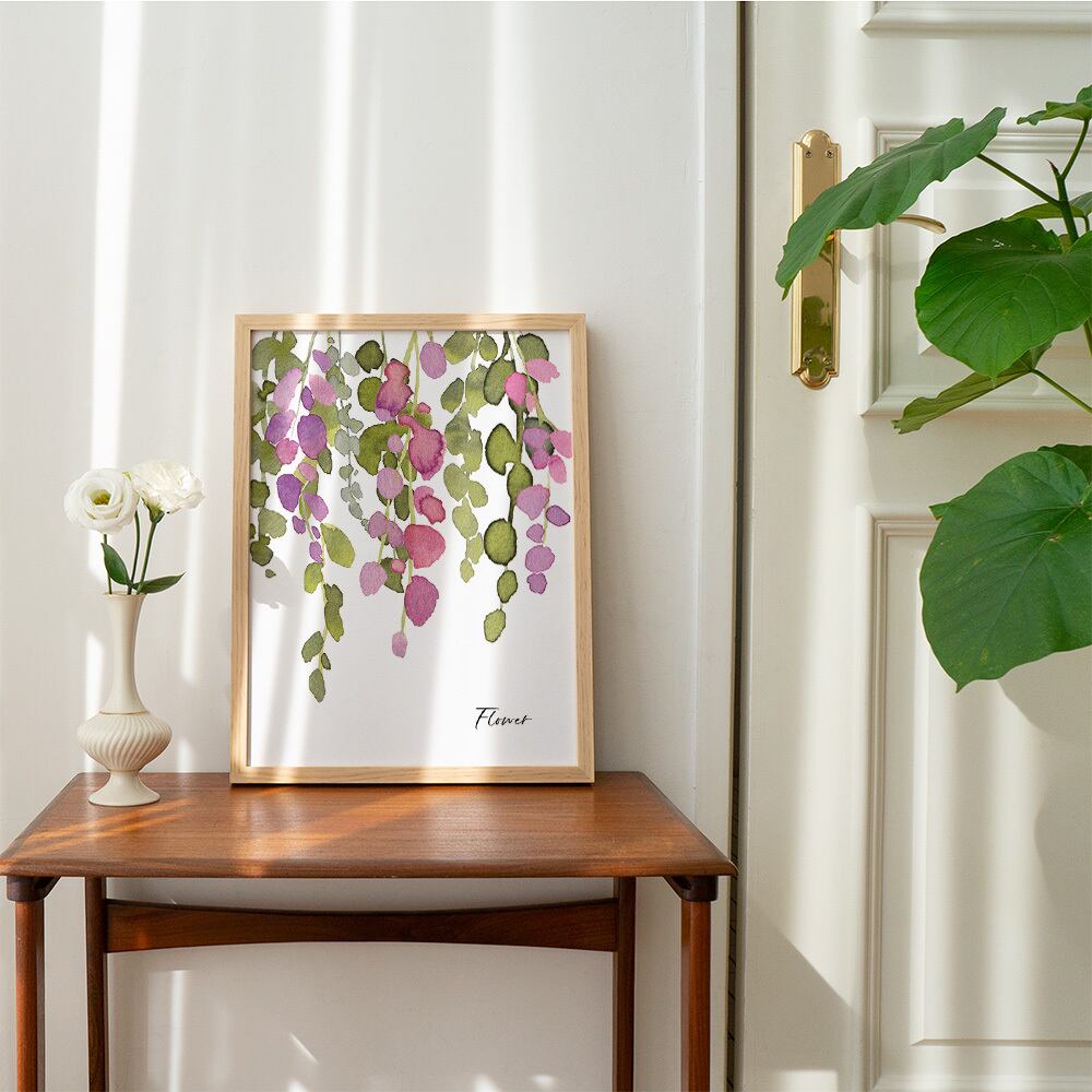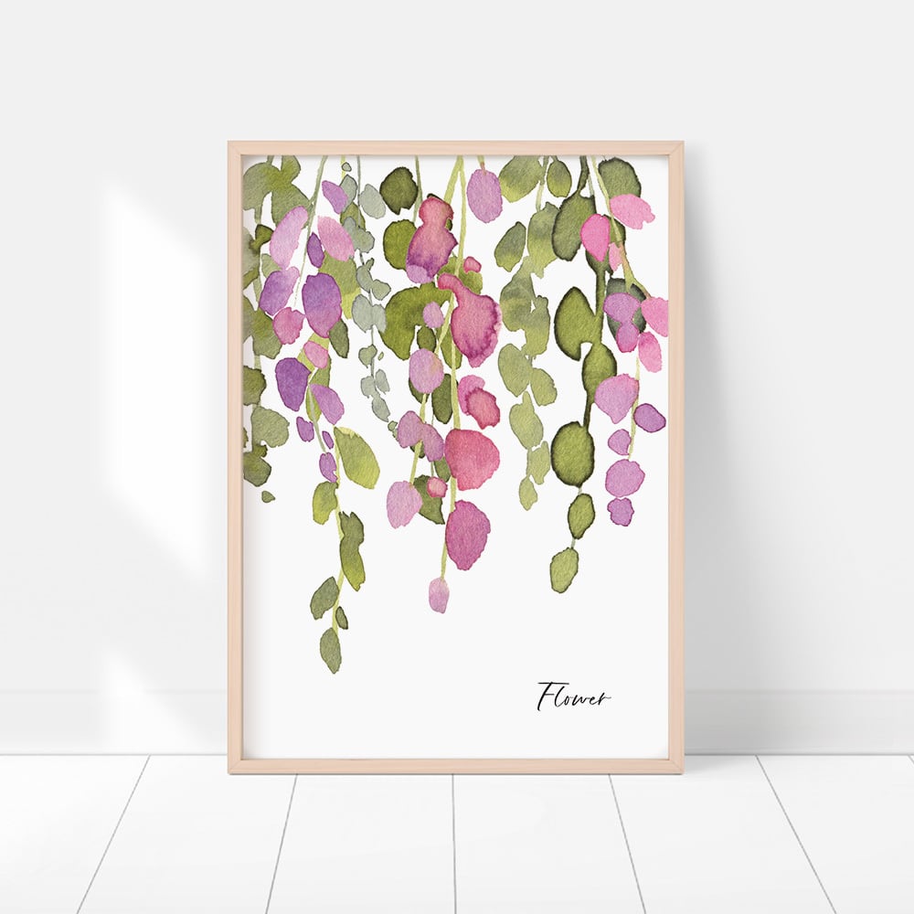 優しいタッチの水彩の花のポスターです。淡いピンクと白の花や、枝垂れて咲く藤の花、ボルドーの大輪ダリアを主役にしたフラワーアレンジがあります。