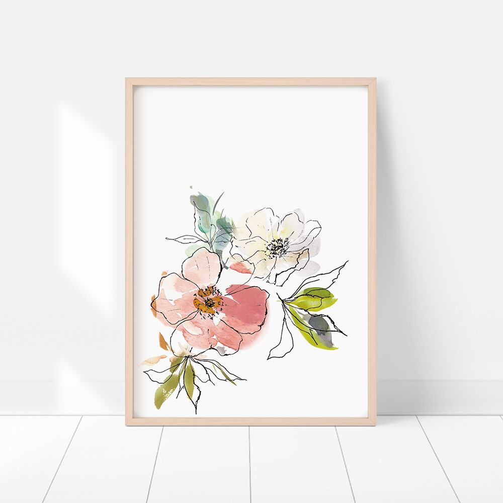 優しいタッチの水彩の花のポスターです。淡いピンクと白の花や、枝垂れて咲く藤の花、ボルドーの大輪ダリアを主役にしたフラワーアレンジがあります。