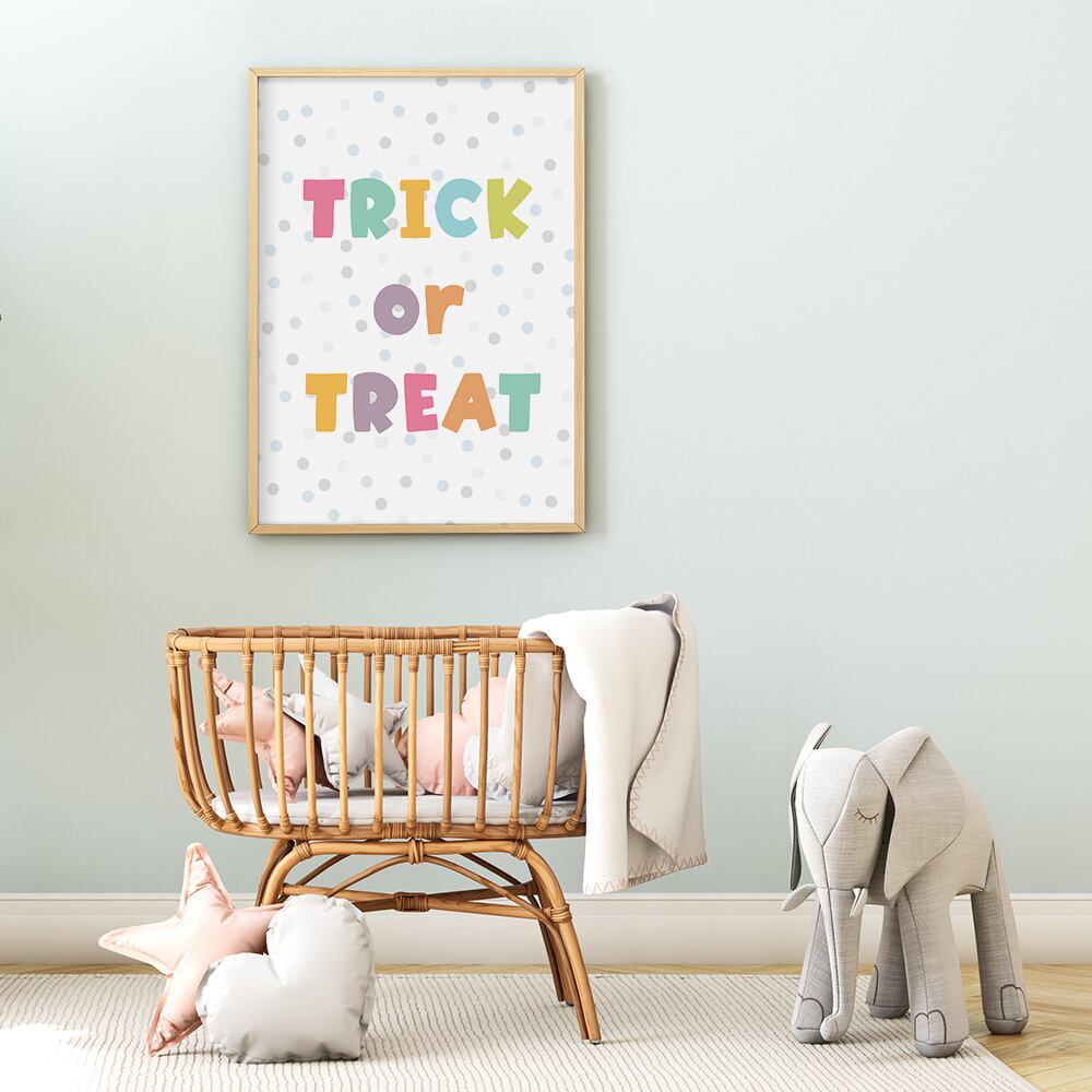 ハロウィンの子供部屋にぴったりのハロウィンシリーズポスターです。Boo!と驚かせているおばけや、カラフルなかぼちゃ、黒ネコなどキュートなキャラクターです。カラフルな英字もあります。
