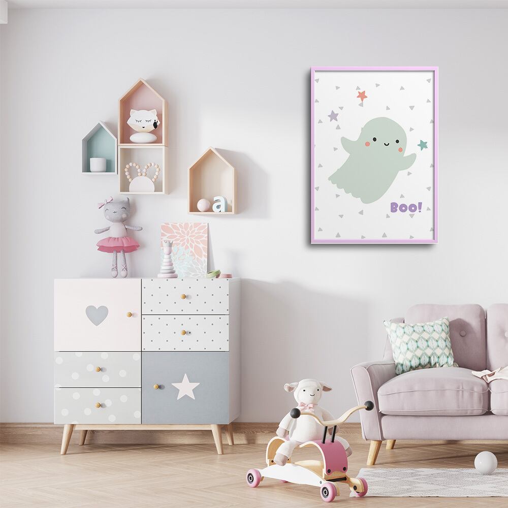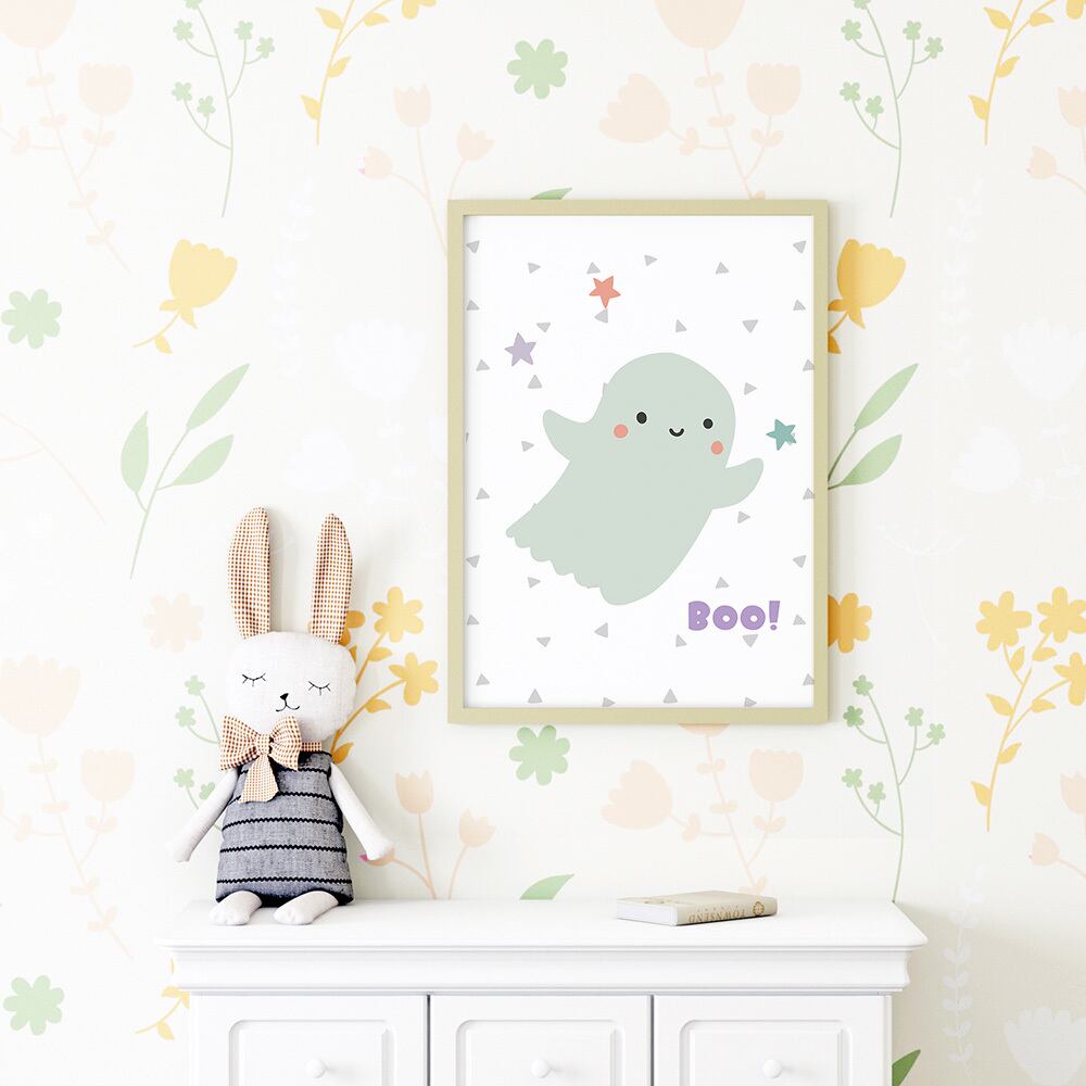 ハロウィンの子供部屋にぴったりのハロウィンシリーズポスターです。Boo!と驚かせているおばけや、カラフルなかぼちゃ、黒ネコなどキュートなキャラクターです。カラフルな英字もあります。