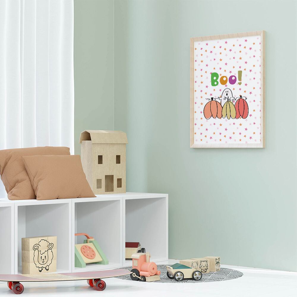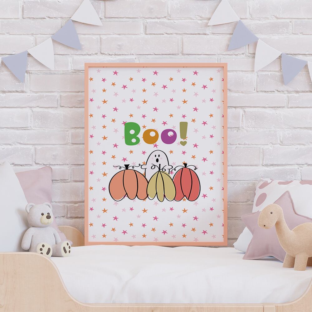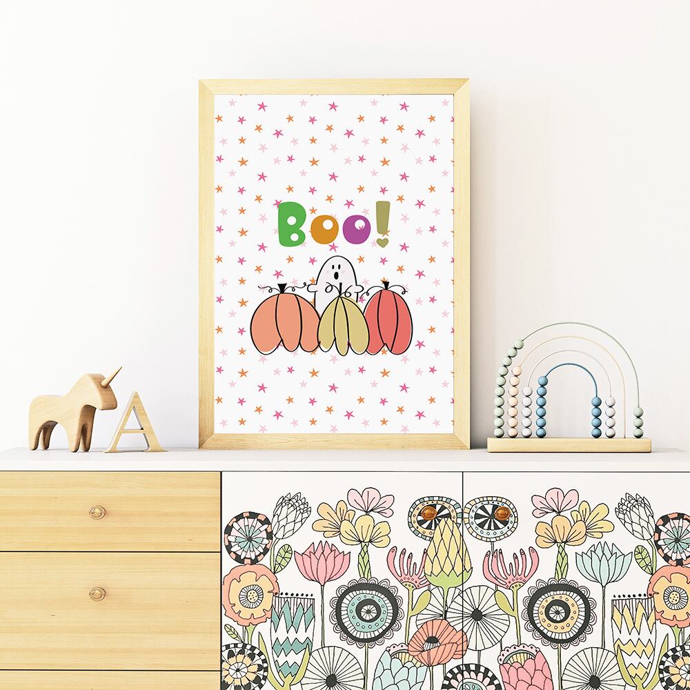ハロウィンの子供部屋にぴったりのハロウィンシリーズポスターです。Boo!と驚かせているおばけや、カラフルなかぼちゃ、黒ネコなどキュートなキャラクターです。カラフルな英字もあります。