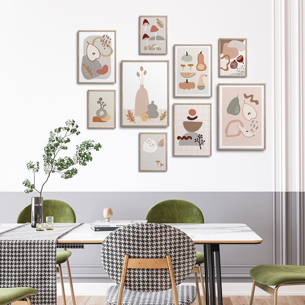 秋の北欧ポスターです。洋梨やザクロ、キノコやカボチャなどが、抽象的な形と共に描かれています。
