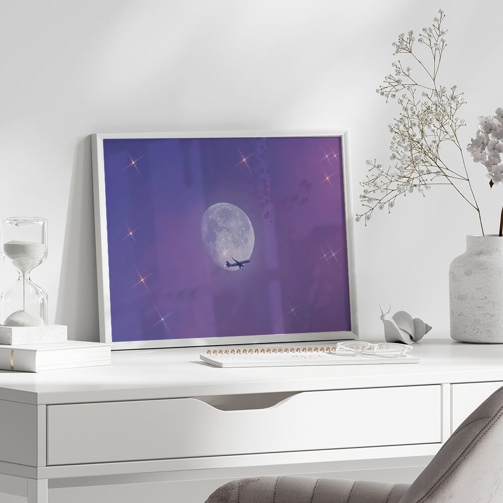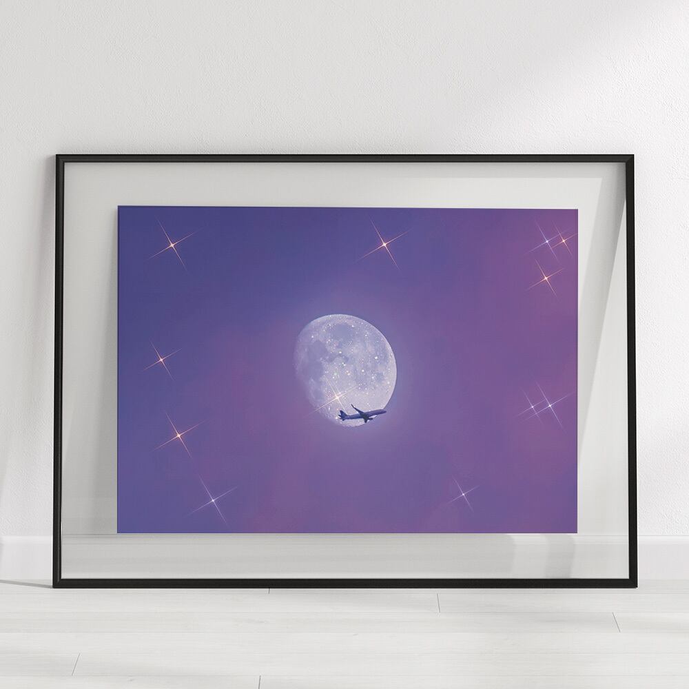 夏の夜空のポスターです。ヤシの木のビーチの風景を幻想的な雰囲気に仕上げたものと、雲や月などの空の横長タイプのものがあります。どちらも、紫色をベースにキラキラした光をあしらっています。