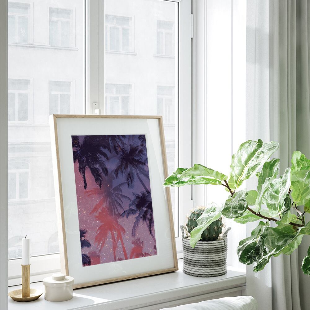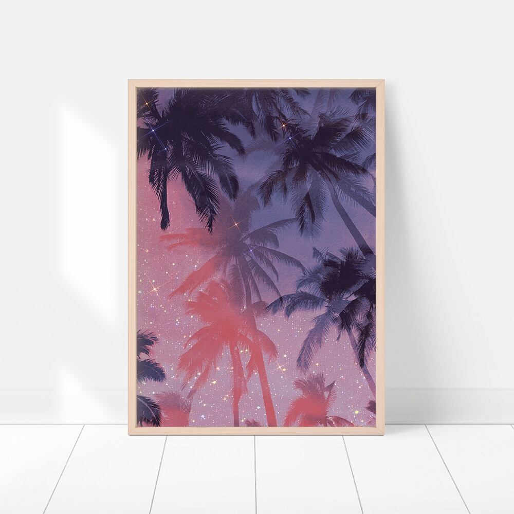 夏の夜空のポスターです。ヤシの木のビーチの風景を幻想的な雰囲気に仕上げたものと、雲や月などの空の横長タイプのものがあります。どちらも、紫色をベースにキラキラした光をあしらっています。