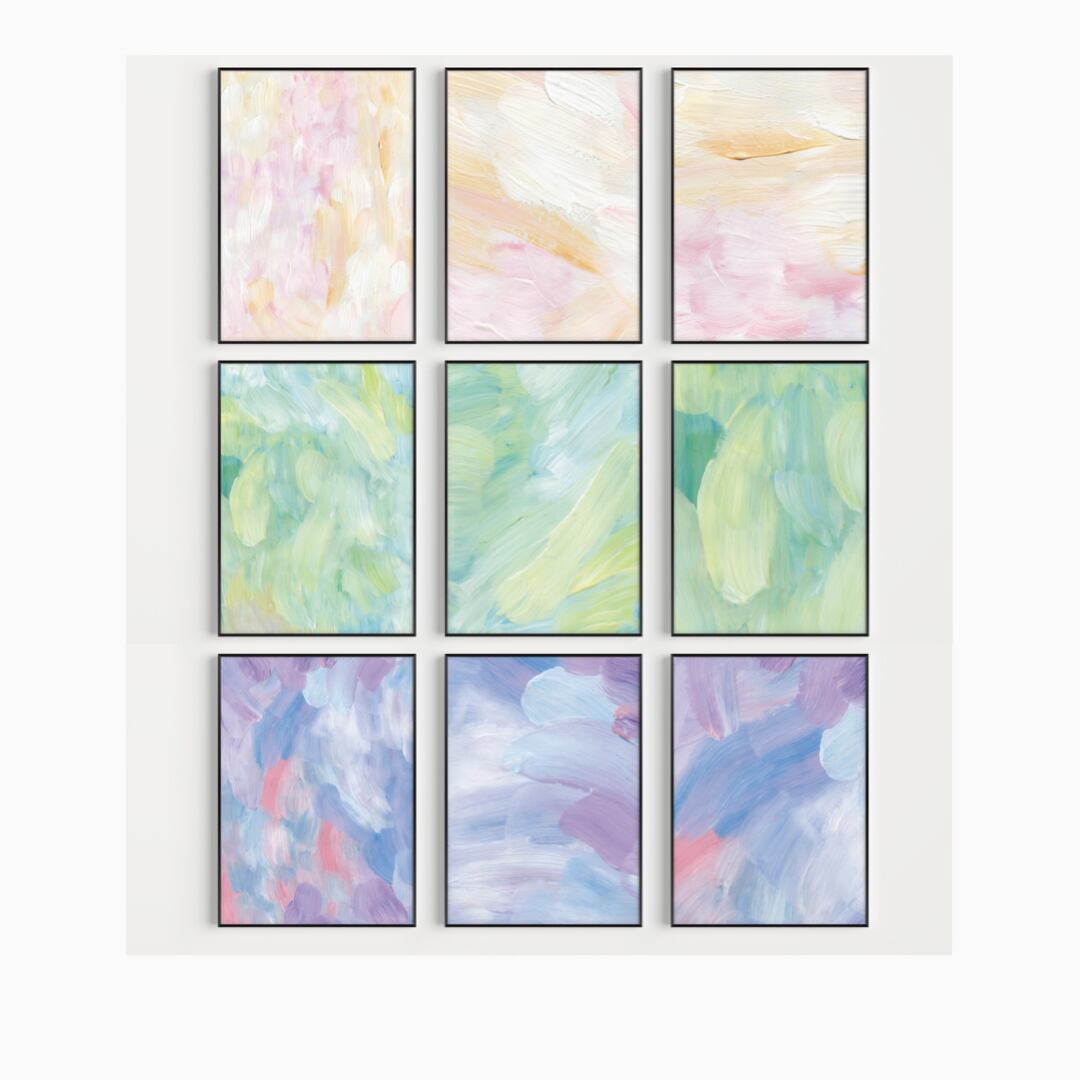 ペイント抽象画のポスターです。ピンク系、グリーン系、ブルー系があります。どれも淡い色使いで優しい印象ですので、お部屋を明るくしてくれます。