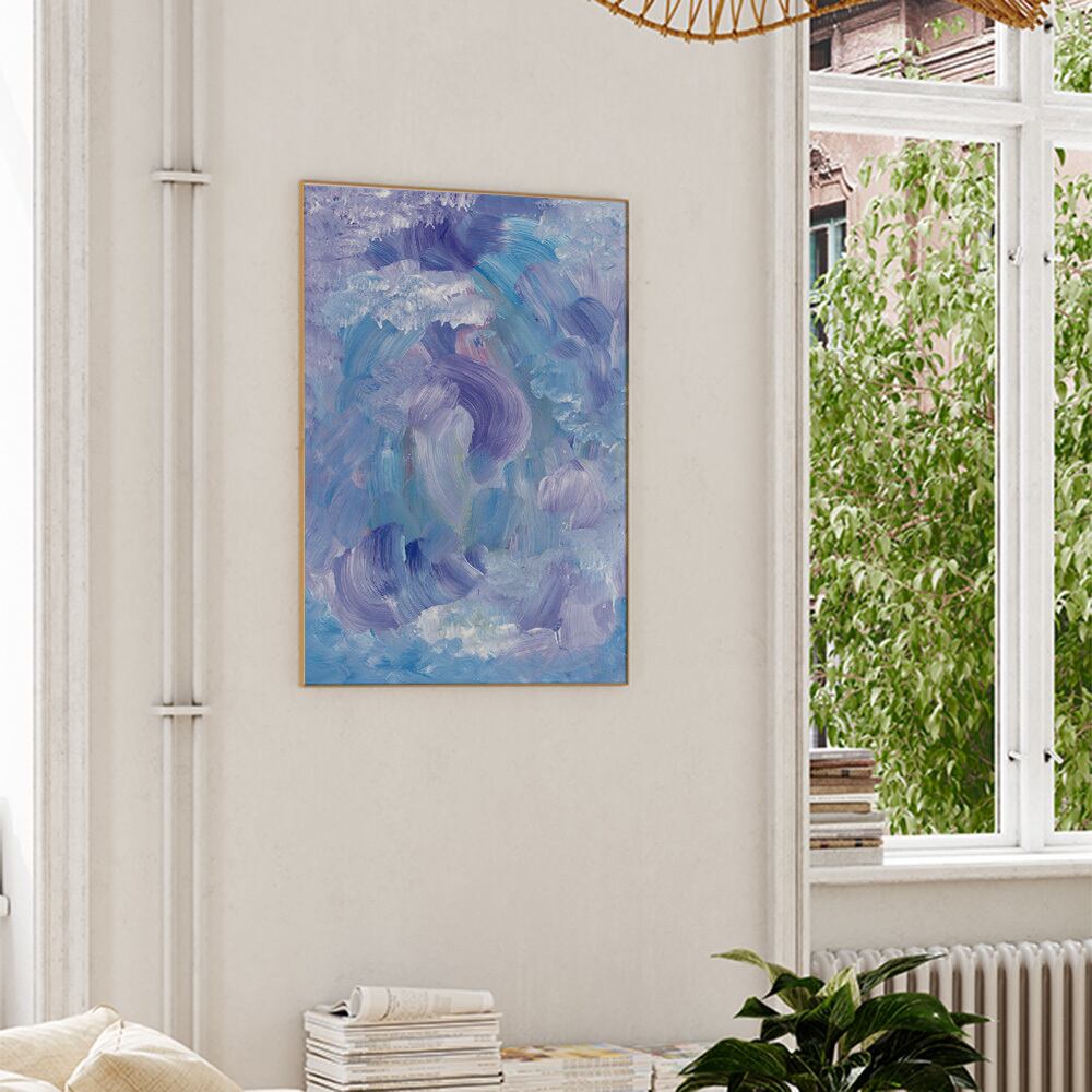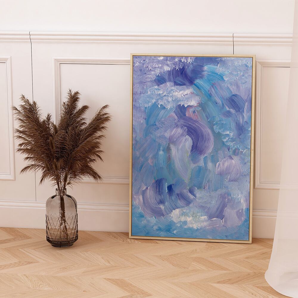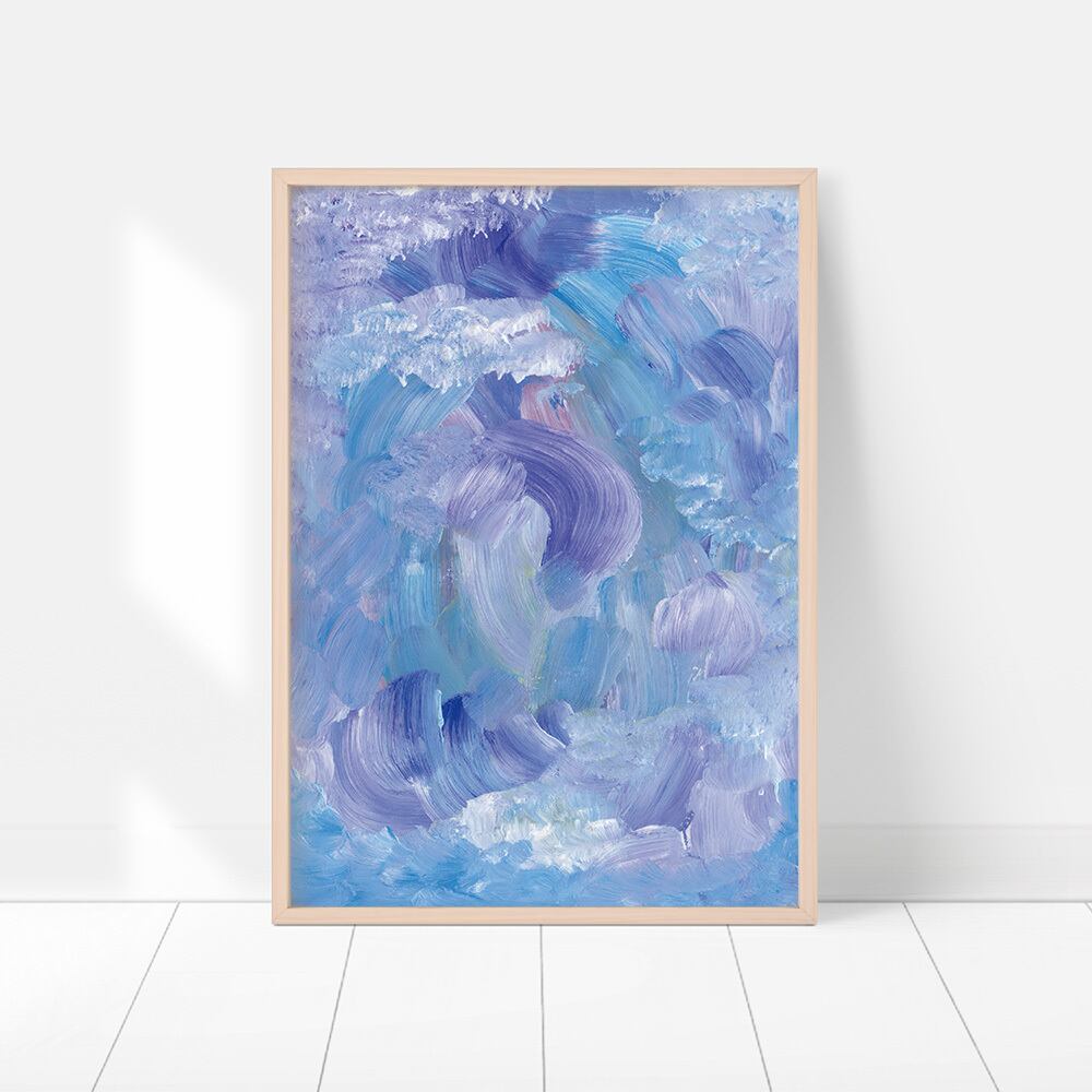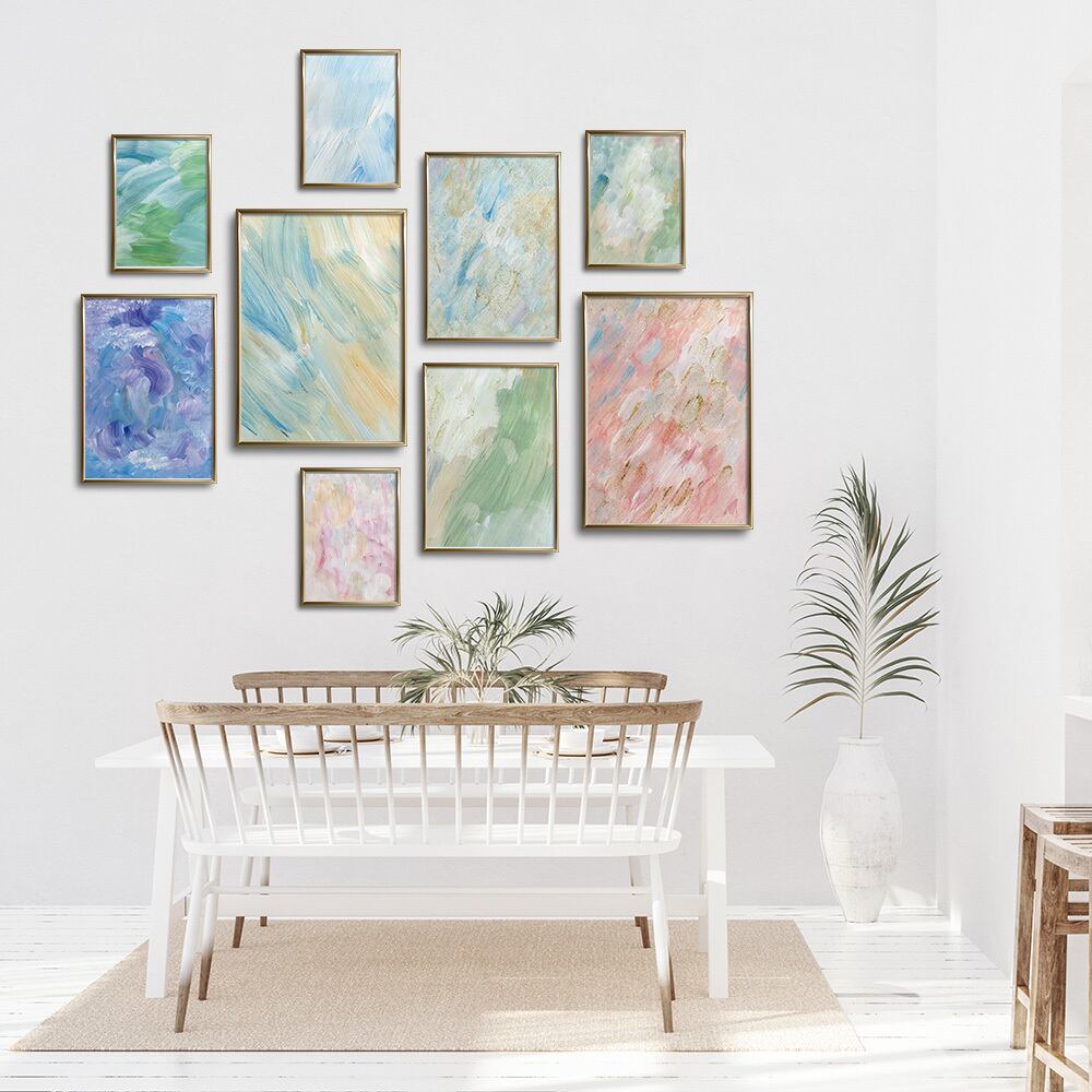 ペイント抽象画のポスターです。黄色と水色の涼しげなもの、グリーンとホワイト、オレンジ系やブルー系など、どれも淡いトーンの優しい色合いです。