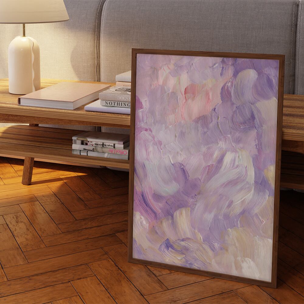 ペイント抽象画のポスターです。黄色やオレンジ、ブルーのレインボーカラー系は夏らしい明るい印象に。パープル系は大人っぽいシックな雰囲気に。ブラック系はモダンな雰囲気になります。