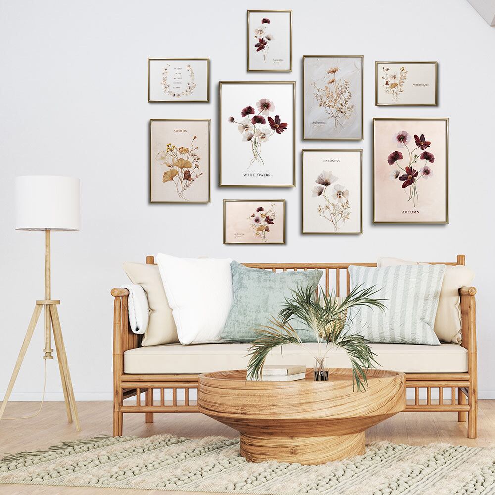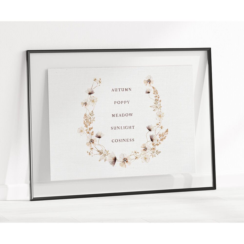 秋の花束のポスターです。ポピーやチョコレートコスモス、イチョウなど、秋の草花が描かれています。ベージュやブラウン、ボルドーの色使いで、でシックで大人っぽい雰囲気になります。