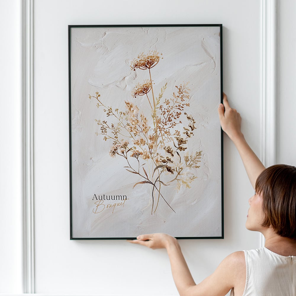 秋の花束のポスターです。ポピーやチョコレートコスモス、イチョウなど、秋の草花が描かれています。ベージュやブラウン、ボルドーの色使いで、でシックで大人っぽい雰囲気になります。