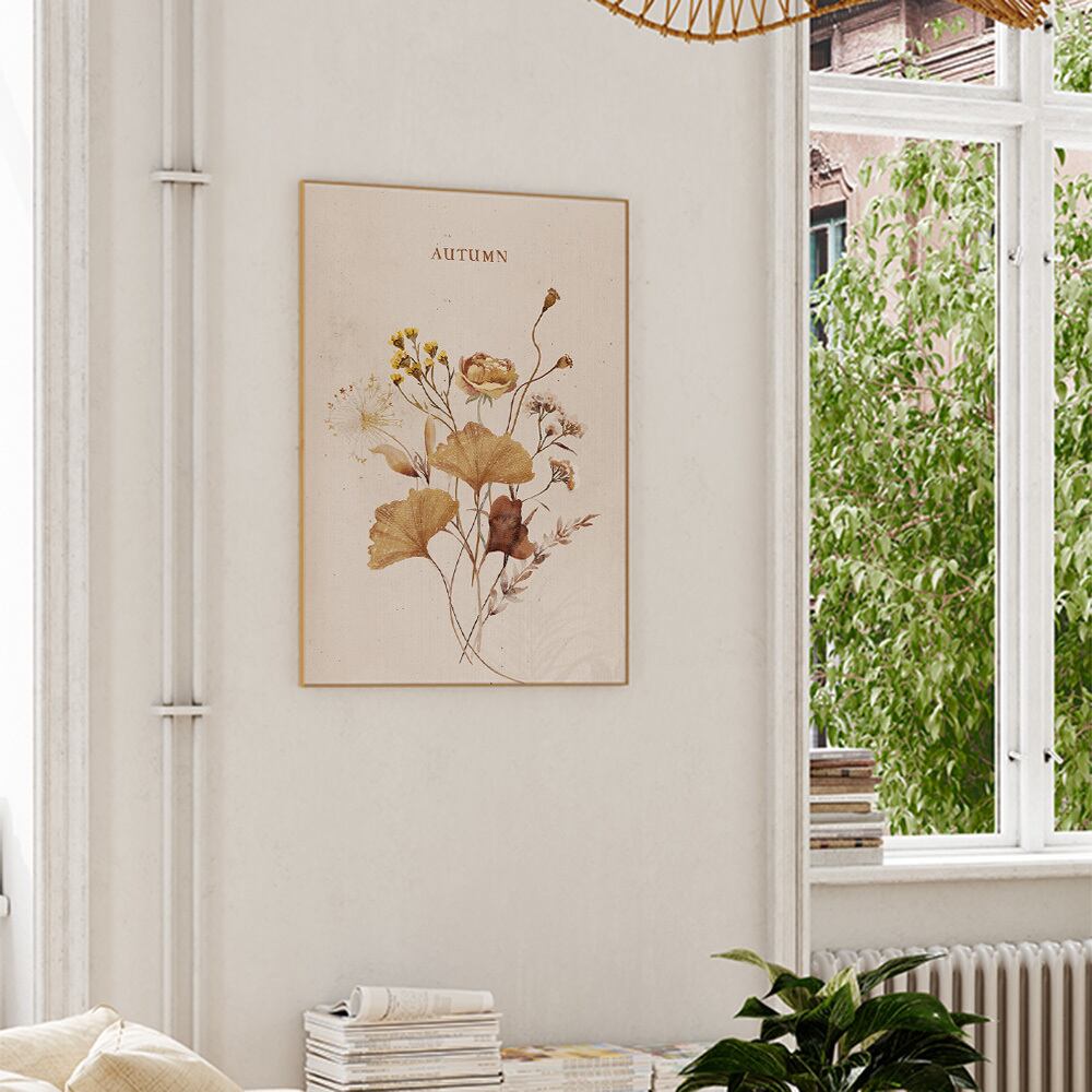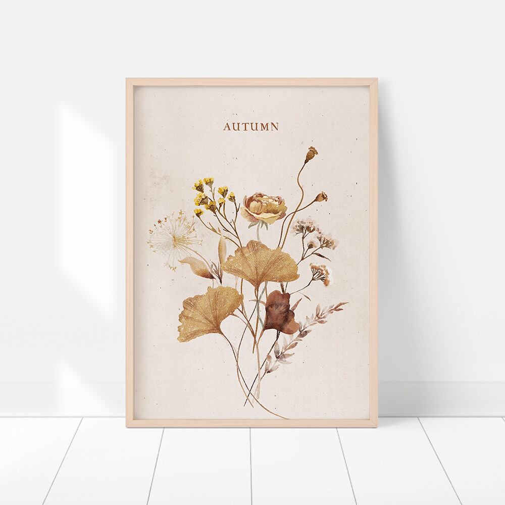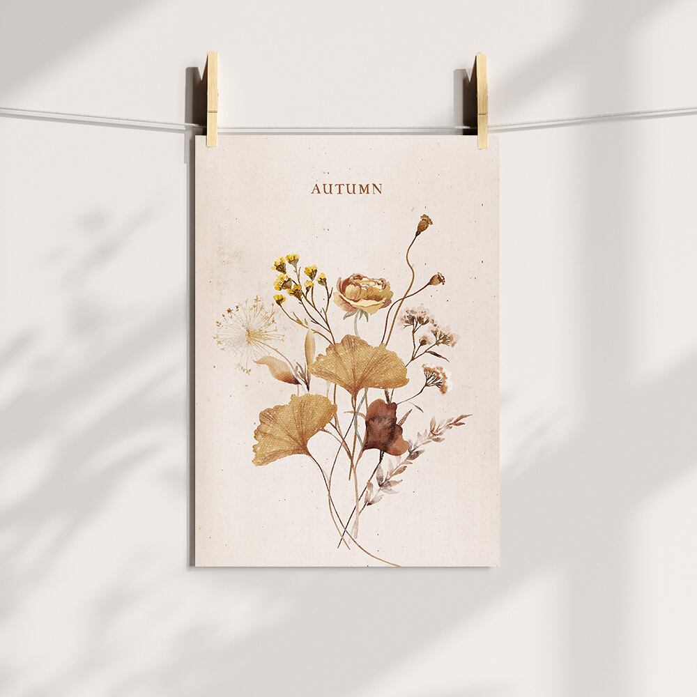 秋の花束のポスターです。ポピーやチョコレートコスモス、イチョウなど、秋の草花が描かれています。ベージュやブラウン、ボルドーの色使いで、でシックで大人っぽい雰囲気になります。