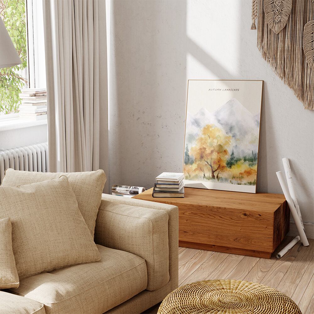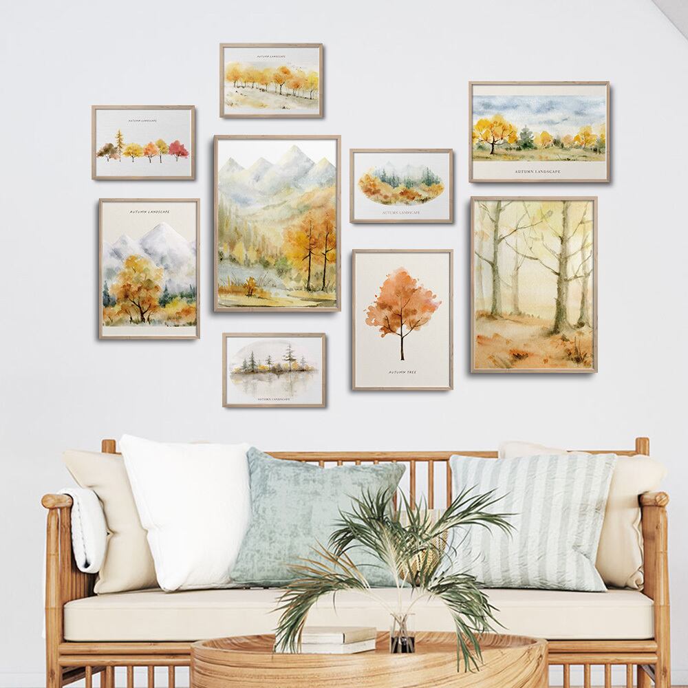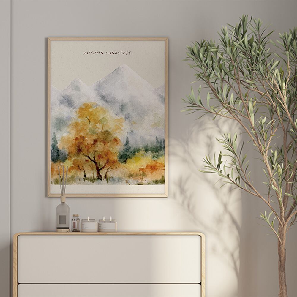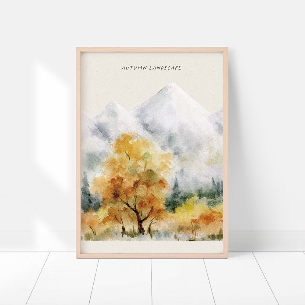 イチョウやもみじに彩られた、秋の風景です。優しいトーンの水彩画で、お部屋に安らぎを与えてくれます。ひと足早く、秋の空気を取り入れてみてはいかがでしょうか。