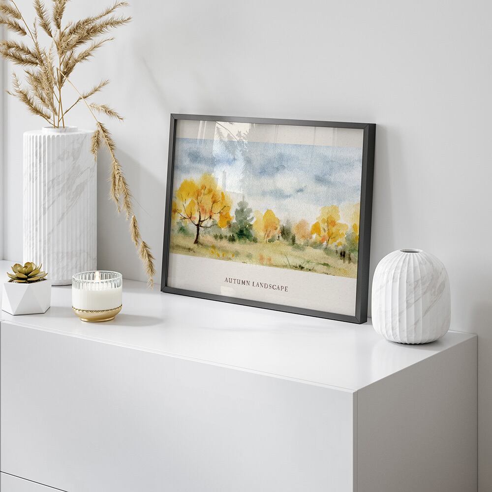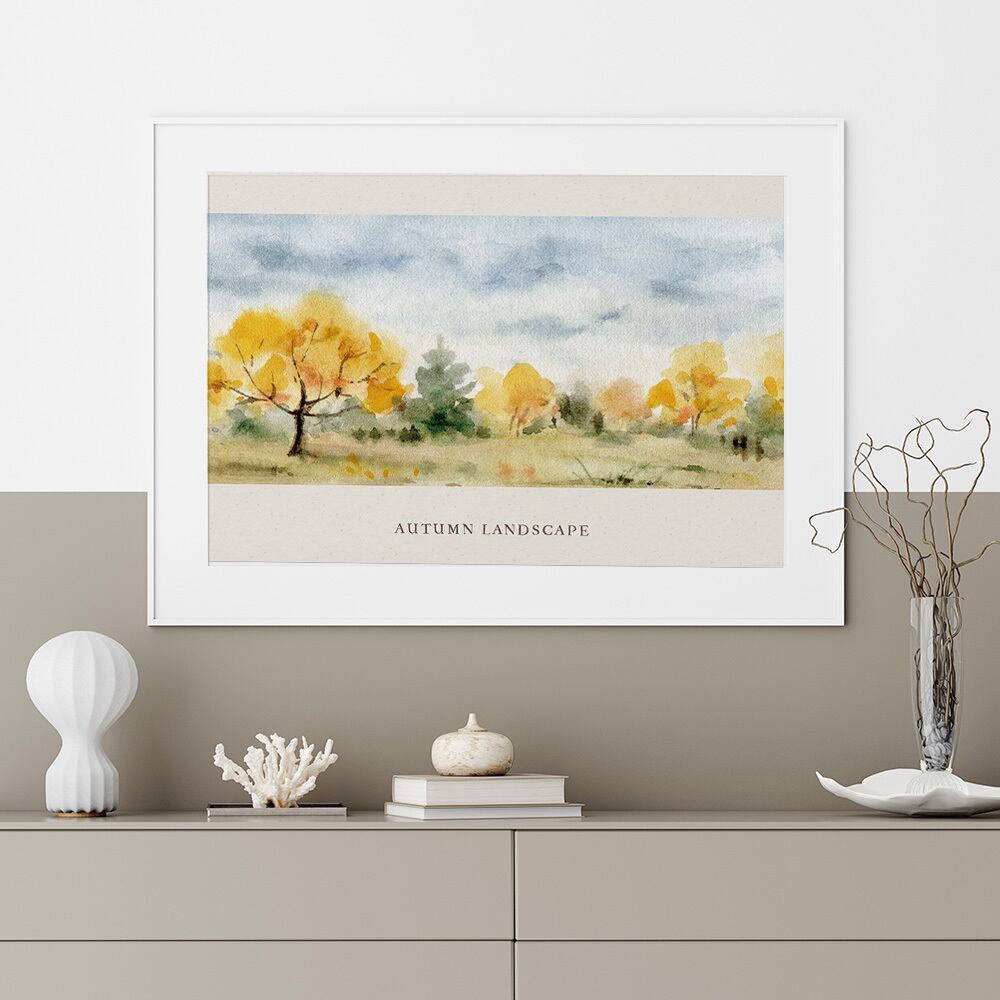 イチョウやもみじに彩られた、秋の風景です。優しいトーンの水彩画で、お部屋に安らぎを与えてくれます。ひと足早く、秋の空気を取り入れてみてはいかがでしょうか。