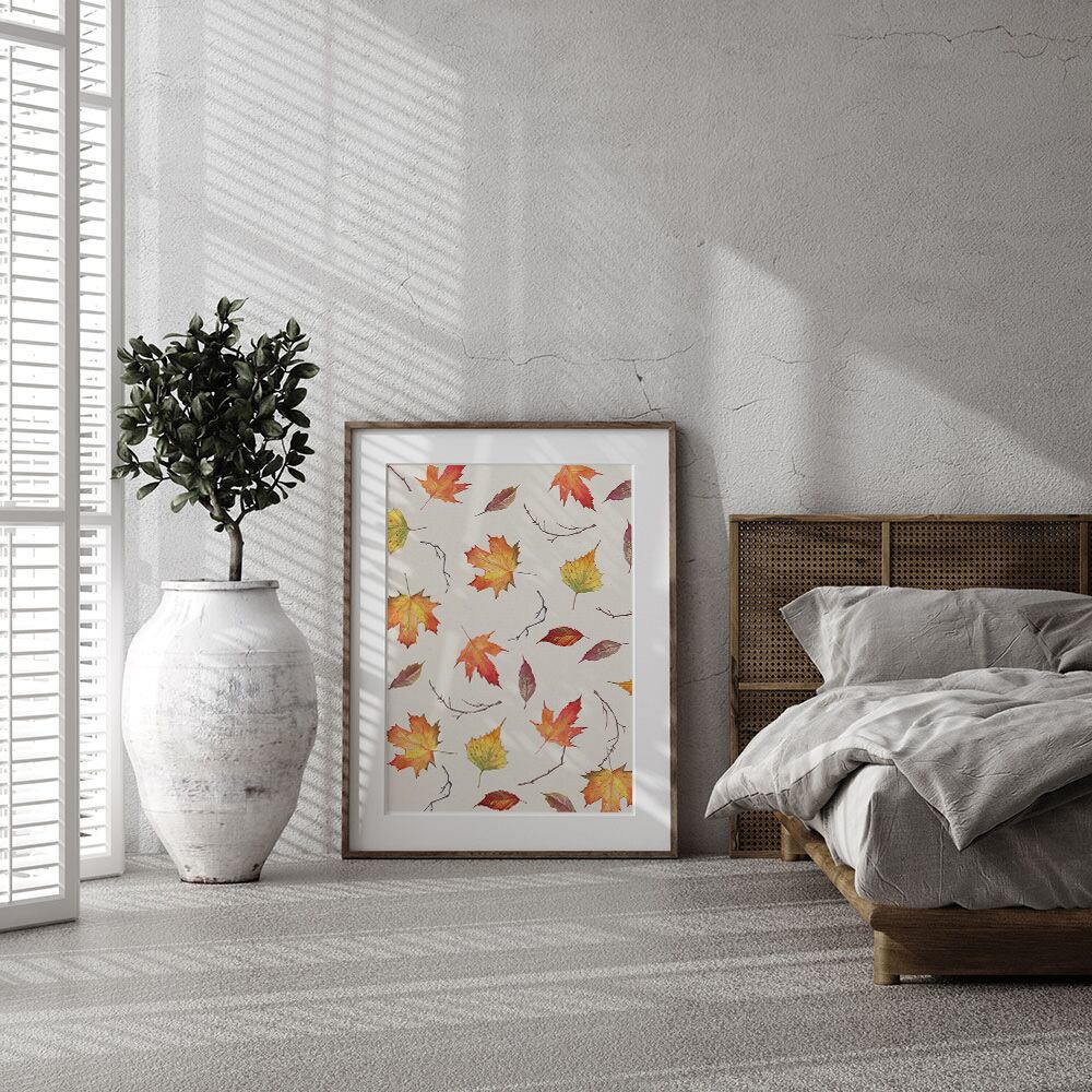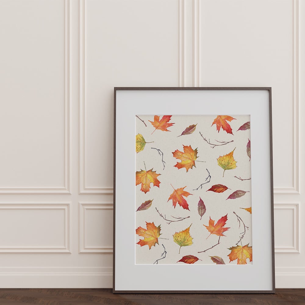 鮮やかな赤や黄色に彩られた秋の葉のポスターです。秋も深まってだんだん空気もひんやりしていく紅葉狩りのシーズンを、ひと足早くインテリアに取り入れてみませんか。