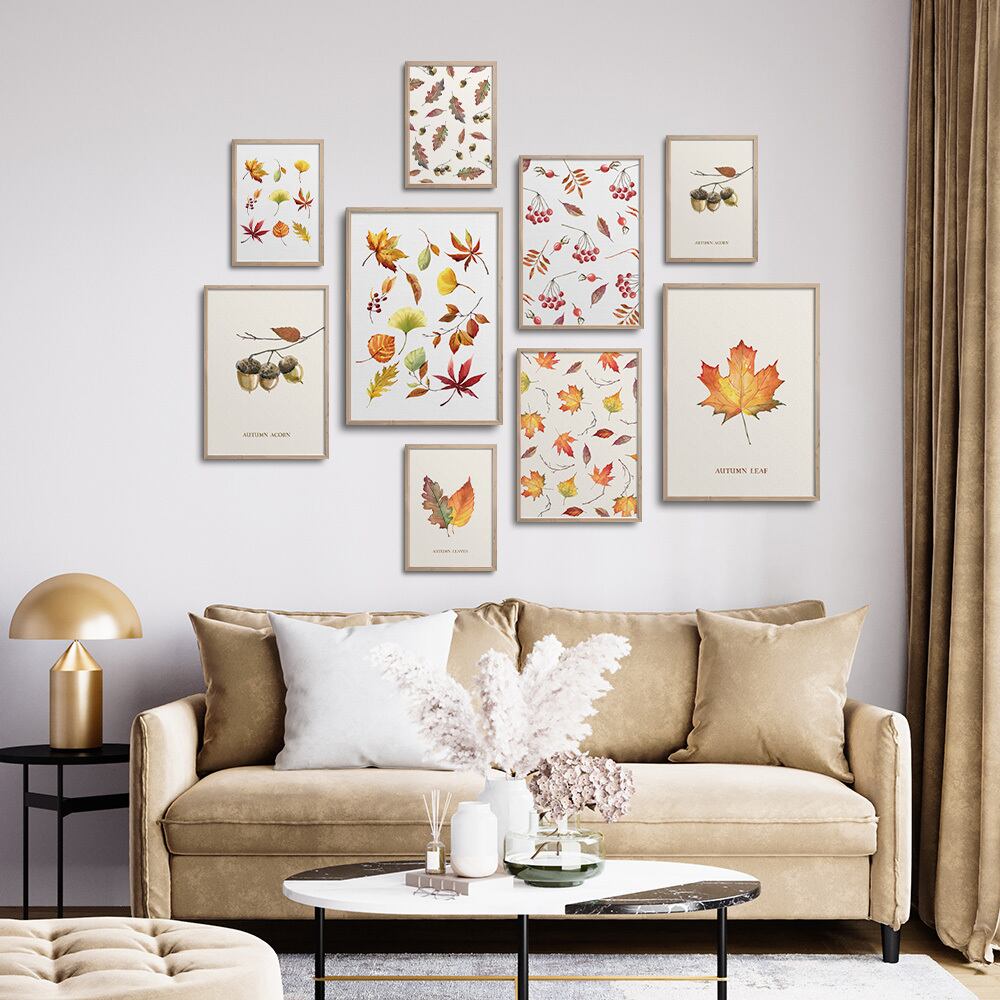 鮮やかな赤や黄色に彩られた秋の葉のポスターです。秋も深まってだんだん空気もひんやりしていく紅葉狩りのシーズンを、ひと足早くインテリアに取り入れてみませんか。