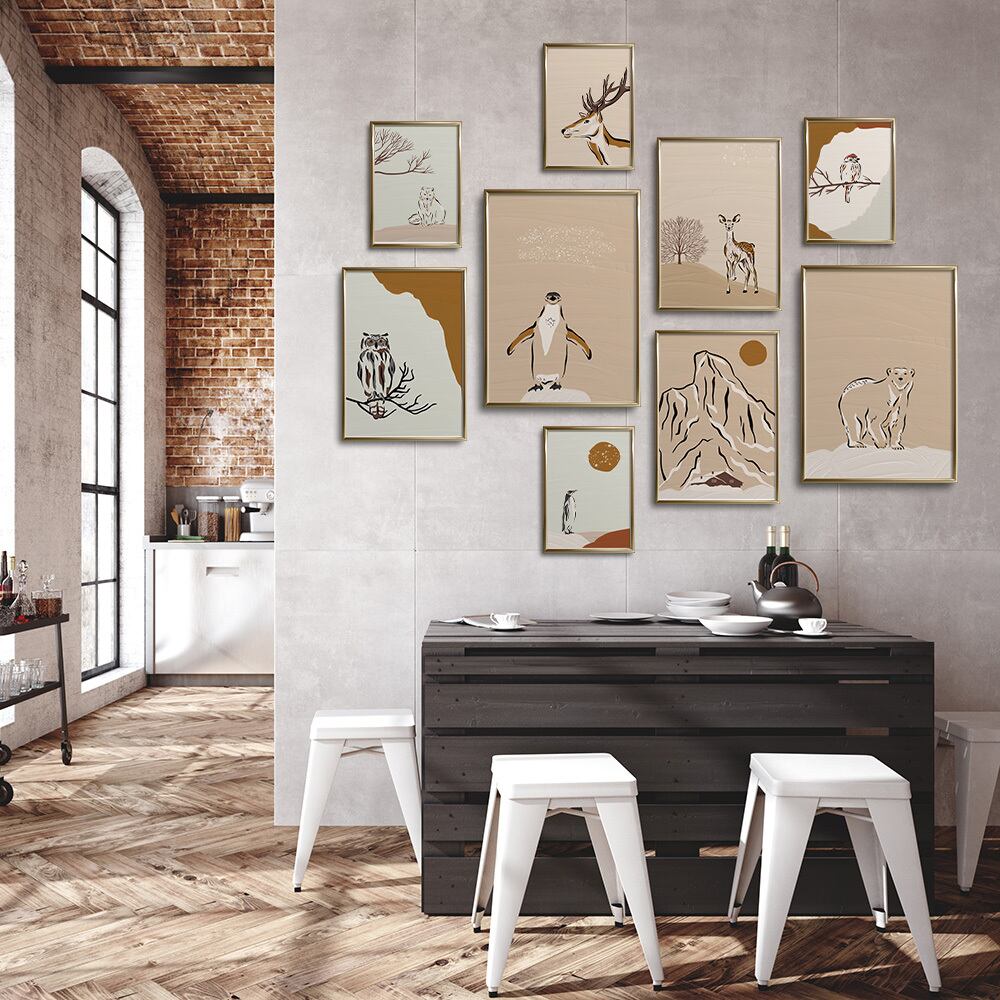 野生の動物たちのポスターです。ペンギン、トナカイ、フクロウ、きつね、クマ、鹿などが描かれています。ベージュやグレージュ、ブラウンを基調としたペイント画です。