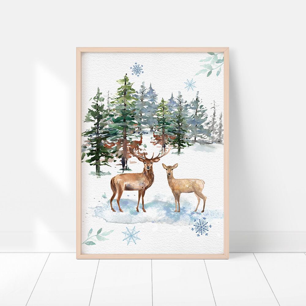 雪景色が広がる風景のポスターです。森や山、湖にたたずむ動物たち。静寂と心地よさ、美しい冬が感じられるポスターです。
