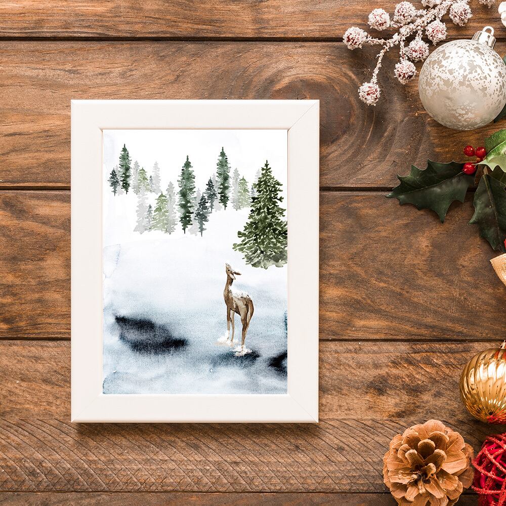 雪景色が広がる風景のポスターです。森や山、湖にたたずむ動物たち。静寂と心地よさ、美しい冬が感じられるポスターです。