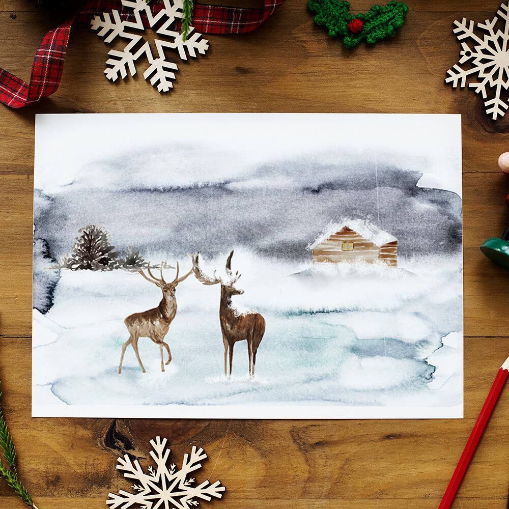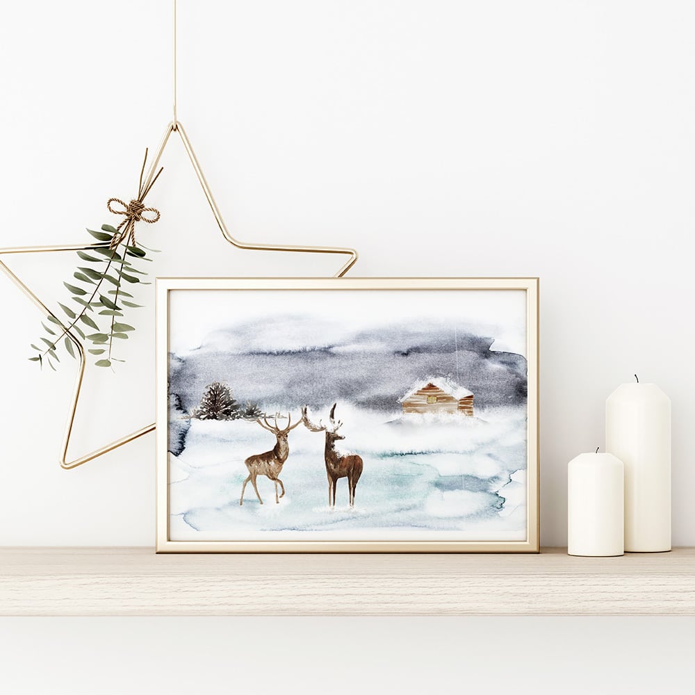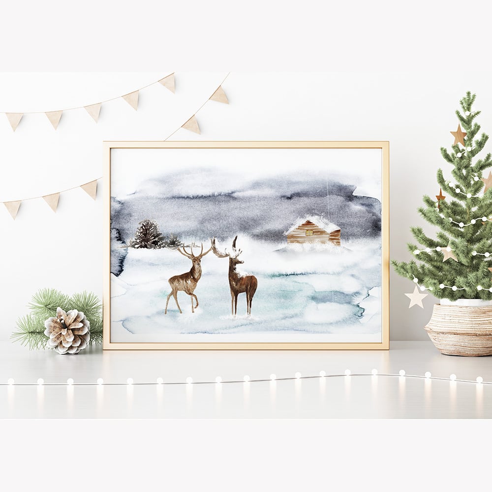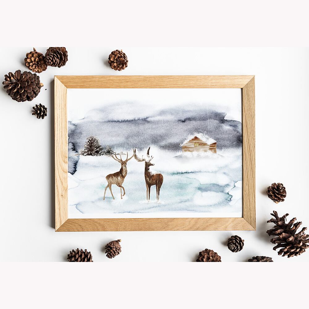 雪景色が広がる風景のポスターです。森や山、湖にたたずむ動物たち。静寂と心地よさ、美しい冬が感じられるポスターです。