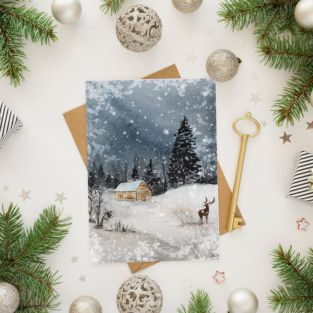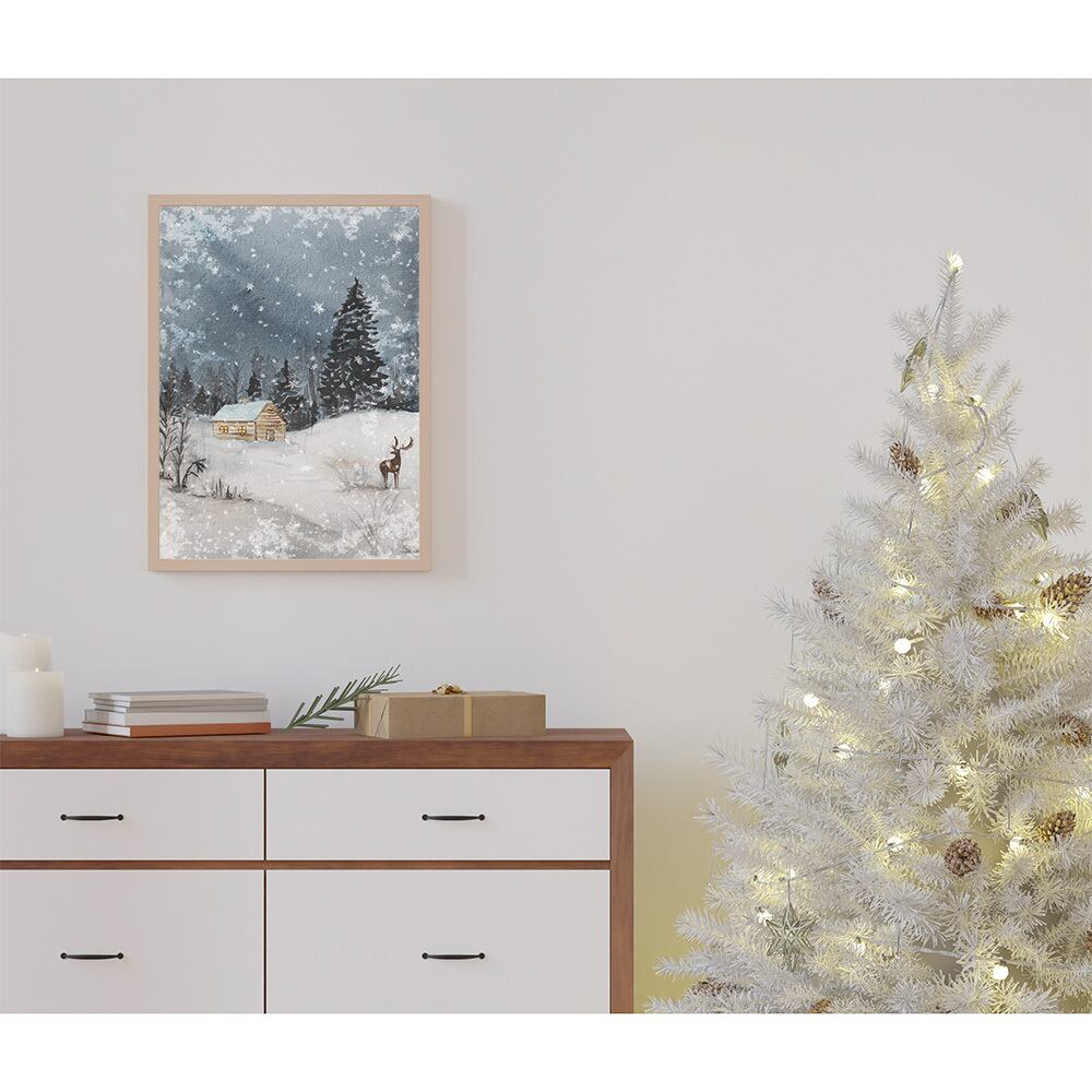 雪景色が広がる風景のポスターです。森や山、湖にたたずむ動物たち。静寂と心地よさ、美しい冬が感じられるポスターです。