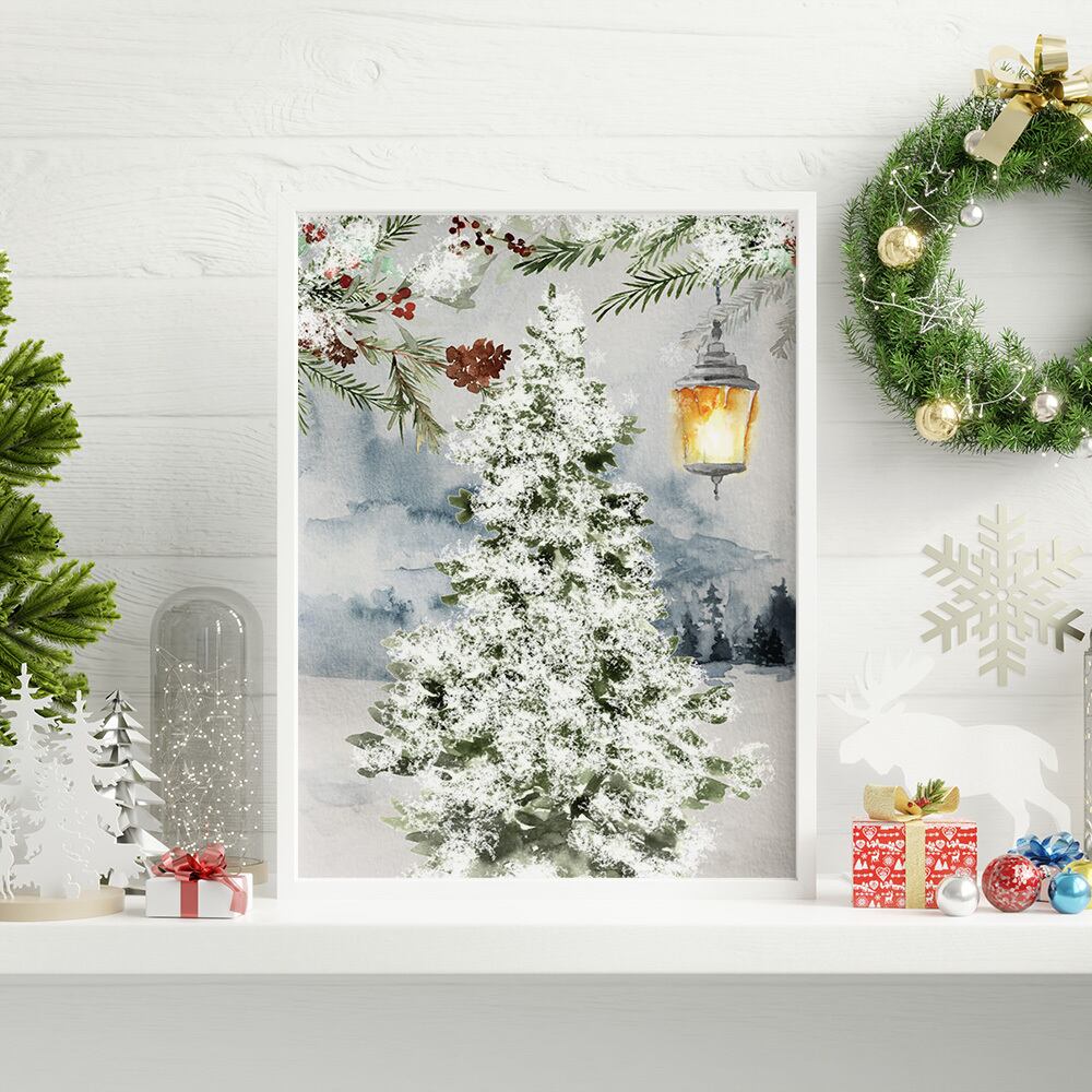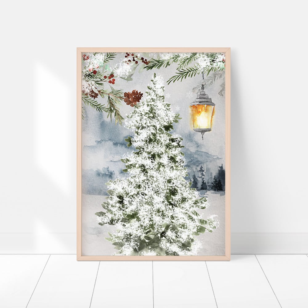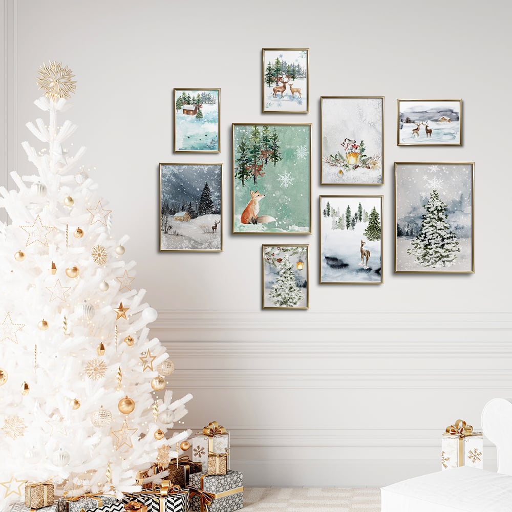 雪景色が広がる風景のポスターです。森や山、湖にたたずむ動物たち。静寂と心地よさ、美しい冬が感じられるポスターです。