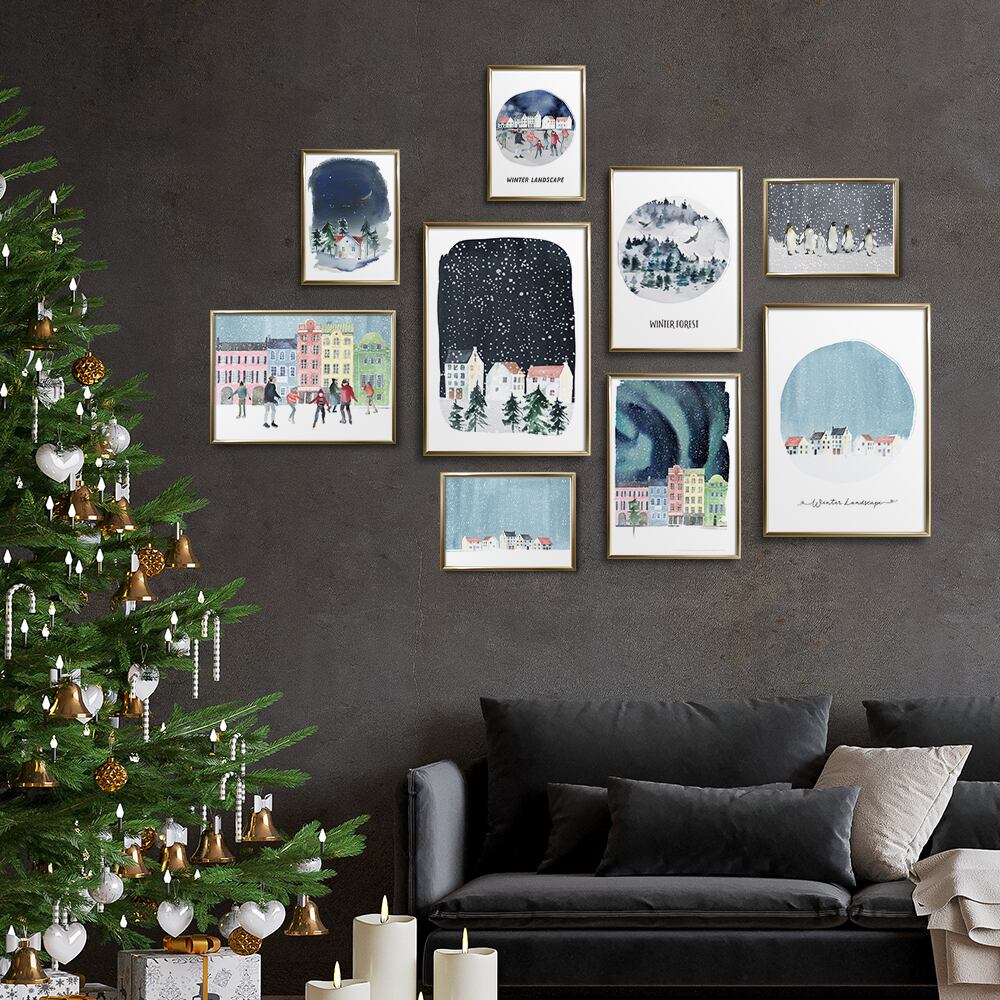 冬の夜を背景に、家や人々、森やオーロラなどの冬景色が描かれたポスターです。静がで心が落ち着くような美しい景色と共に、冬の夜を過ごしてみませんか。