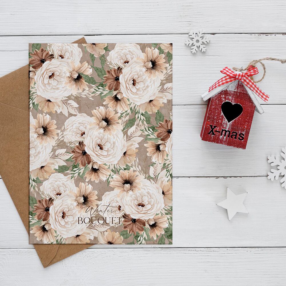 ベージュと白を基調とした花や葉を使った、ブーケやリース、フレーム飾りのポスターです。寒い冬の中でも温かみが感じられます。