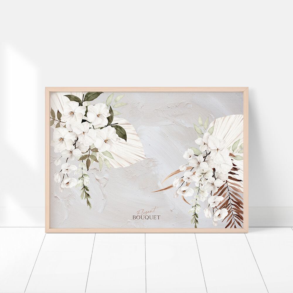 ベージュと白を基調とした花や葉を使った、ブーケやリース、フレーム飾りのポスターです。寒い冬の中でも温かみが感じられます。