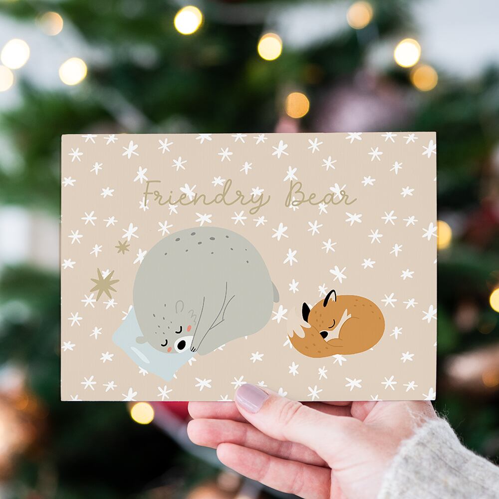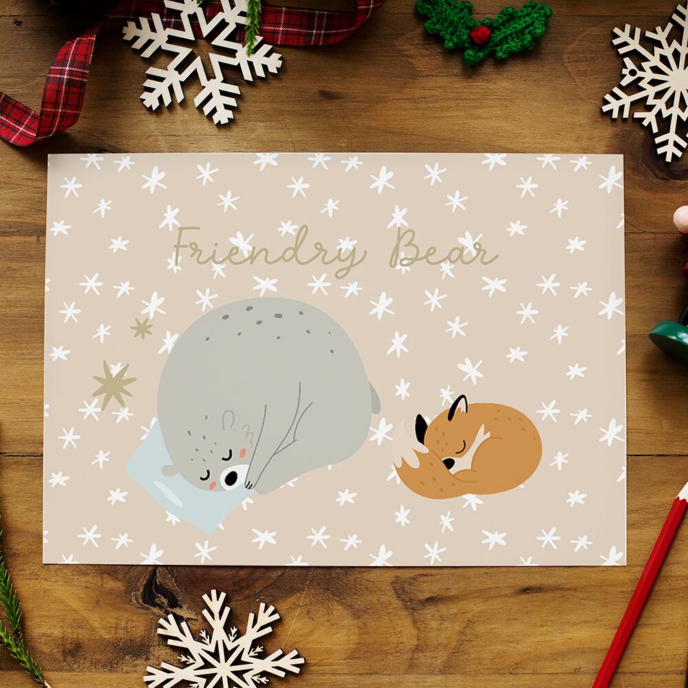 かわいいシロクマのイラストです。仲良しのキツネや小鳥と一緒に、ティータイムを過ごしたり、流れ星を見たり、のんびり寝転がったりしてリラックスしています。子供部屋にもおすすめです。